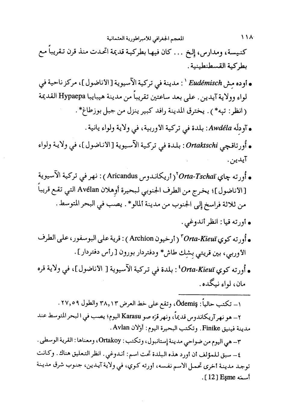 (4) سبق للمؤلف أن أورد هذه البلدة تحت اسم: أندوغي. انظر التعليق هناك. وكانت توجد مدينة أخرى تحمل الاسم نفسه، أورته كوي، في ولاية آيدين، جنوب شرق مدينة أسمه [12].