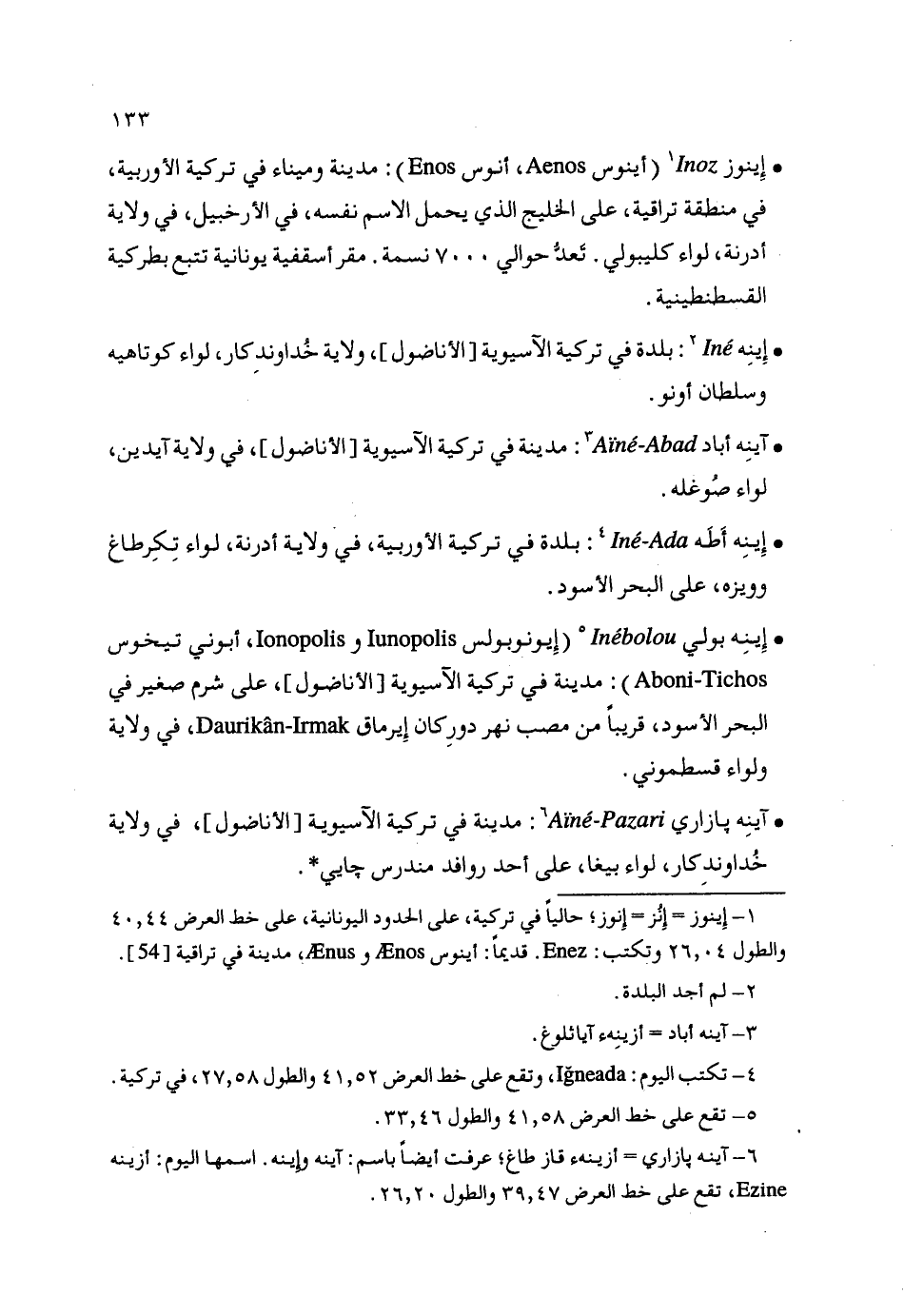 (1) إينوز إنز إنوز حاليا في تركية، على الحدود اليونانية، على خط العرض 44، 40 والطول 04، 26وتكتب:. قديما: أينوس و، مدينة في تراقية [54].