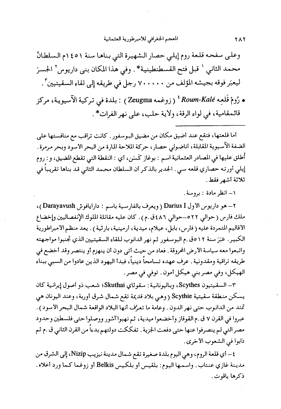 (4) أي قلعة الروم، وهي اليوم بلدة صغيرة تقع شمال مدينة نيزيب، إلى الشرق من مدينة غازي عنتاب. واسمها اليوم: بلقيس أو بلكيس أو زوغما كما ورد أعلاه.