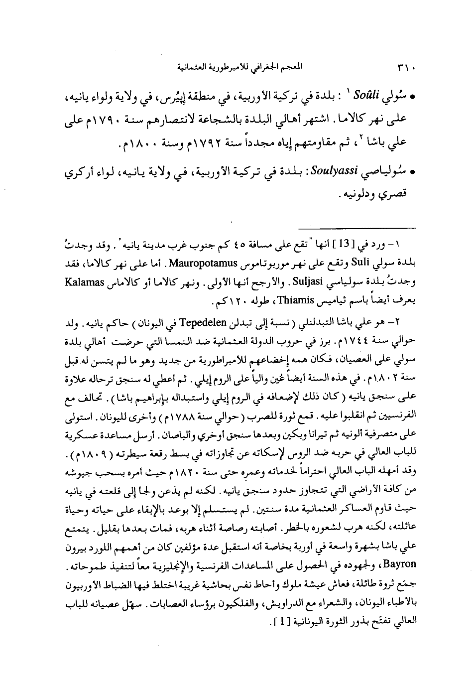 (2) هو علي باشا التبدلنلي (نسبة إلى تبدلن في اليونان) حاكم يانيه. ولد حوالي سنة 1744م. برز في حروب الدولة العثمانية ضد النمسا التي حرضت أهالي بلدة سولي على العصيان، فكان همه إخضاعهم للأمبراطورية من جديد وهو ما لم يتسن له قبل سنة 1802م. في هذه السنة أيضا عين واليا على الروم إيلي. ثم أعطي له سنجق ترحاله علاوة على سنجق يانيه (كان ذلك لإضعافه في الروم إيلي واستبداله بإبراهيم باشا). تحالف مع الفرنسيين ثم انقلبوا عليه. قمع ثورة للصرب (حوالي سنة 1788م) وأخرى لليونان. استولى على متصرفية ألونيه ثم تيرانا وبكين وبعدها سنجق أوخري وألباصان. أرسل مساعدة عسكرية للباب العالي في حربه ضد الروس لإسكاته عن تجاوزاته في بسط رقعة سيطرته (1809م).