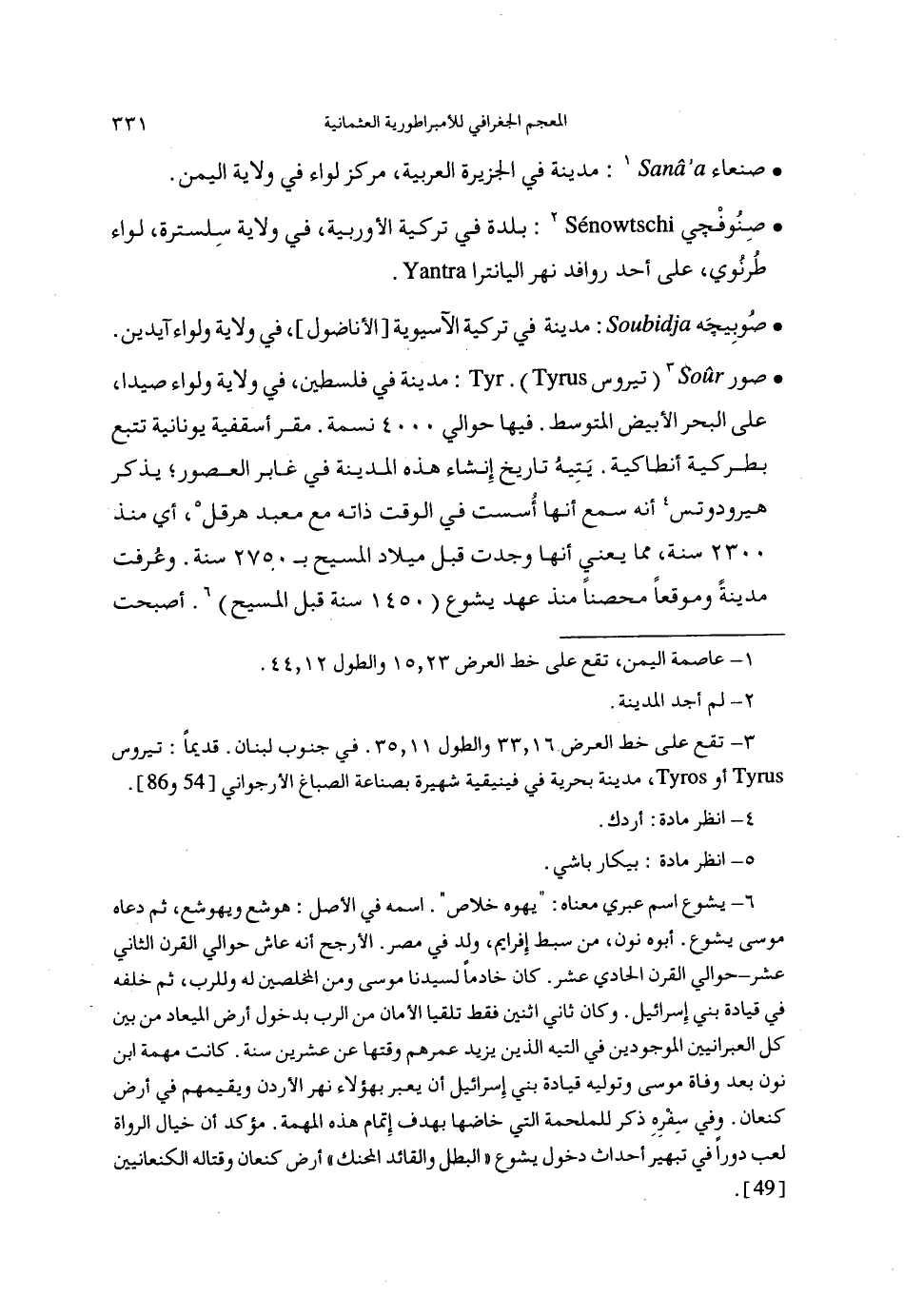 (3) تقع على خط العرض 16، 33والطول 11، 35. في جنوب لبنان. قديما: تيروس أو، مدينة بحرية في فينيقية شهيرة بصناعة الصباغ الأرجواني [54و 86].
