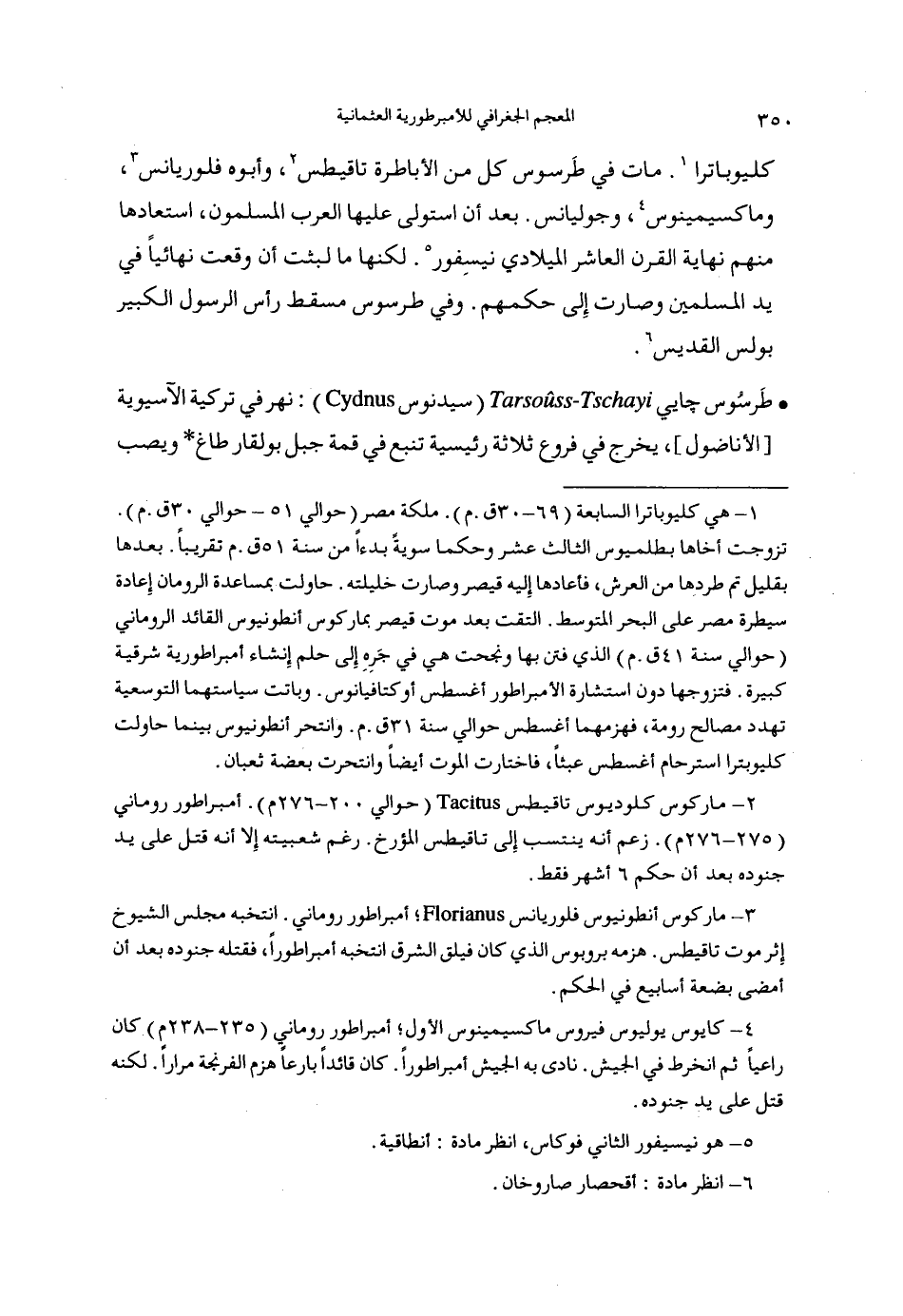 كليوباترا (1). مات في طرسوس كل من الأباطرة تاقيطس (2)، وأبوه فلوريانس (3)، وماكسيمينوس (4)، وجوليانس. بعد أن استولى عليها العرب المسلمون، استعادها منهم نهاية القرن العاشر الميلادي نيسفور (5). لكنها ما لبثت أن وقعت نهائيا في يد المسلمين وصارت إلى حكمهم. وفي طرسوس مسقط رأس الرسول الكبير بولس القديس (6).