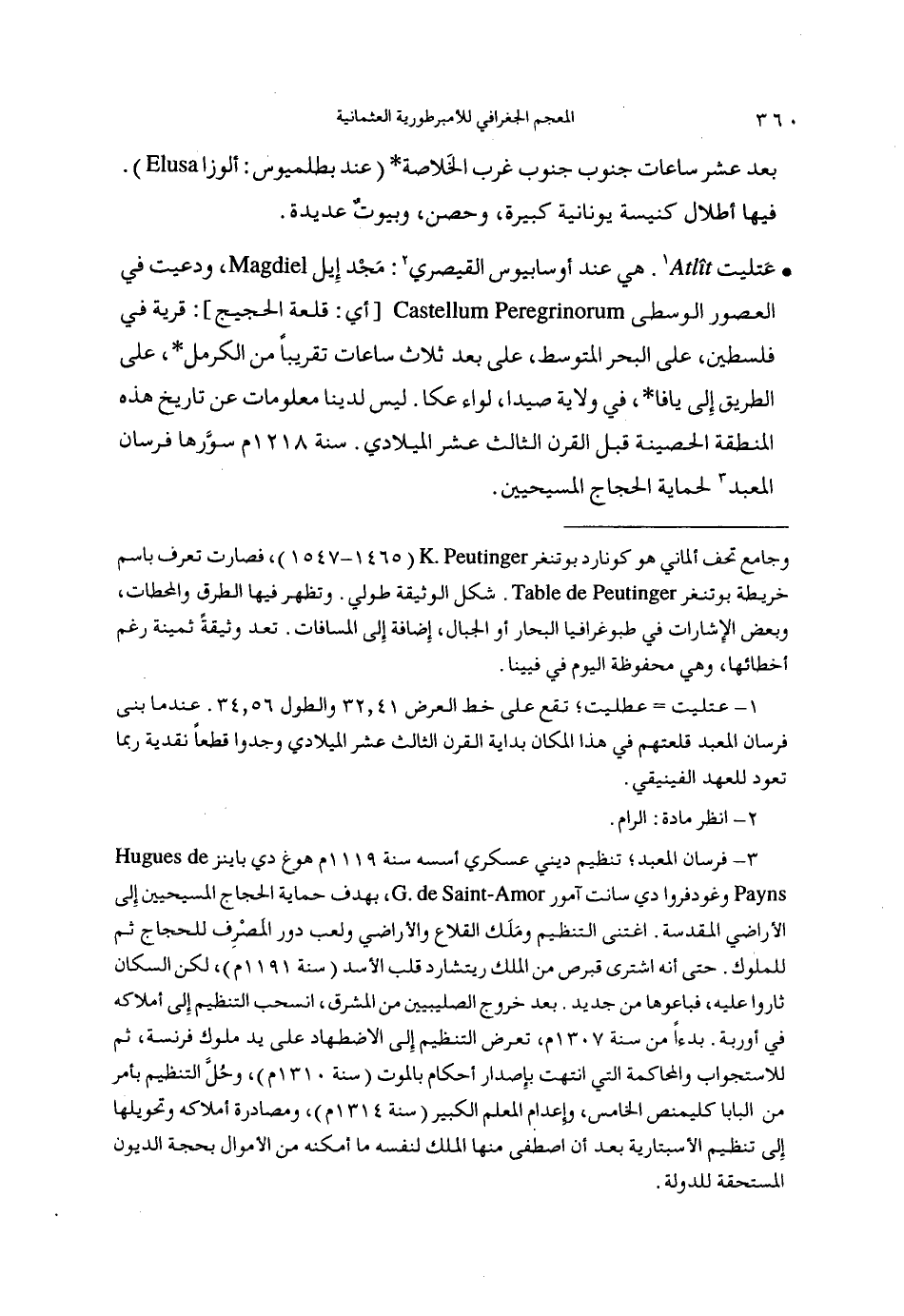 (1) عتليت عطليت تقع على خط العرض 41، 32والطول 56، 34. عند ما بنى فرسان المعبد قلعتهم في هذا المكان بداية القرن الثالث عشر الميلادي وجدوا قطعا نقدية ربما تعود للعهد الفينيقي.