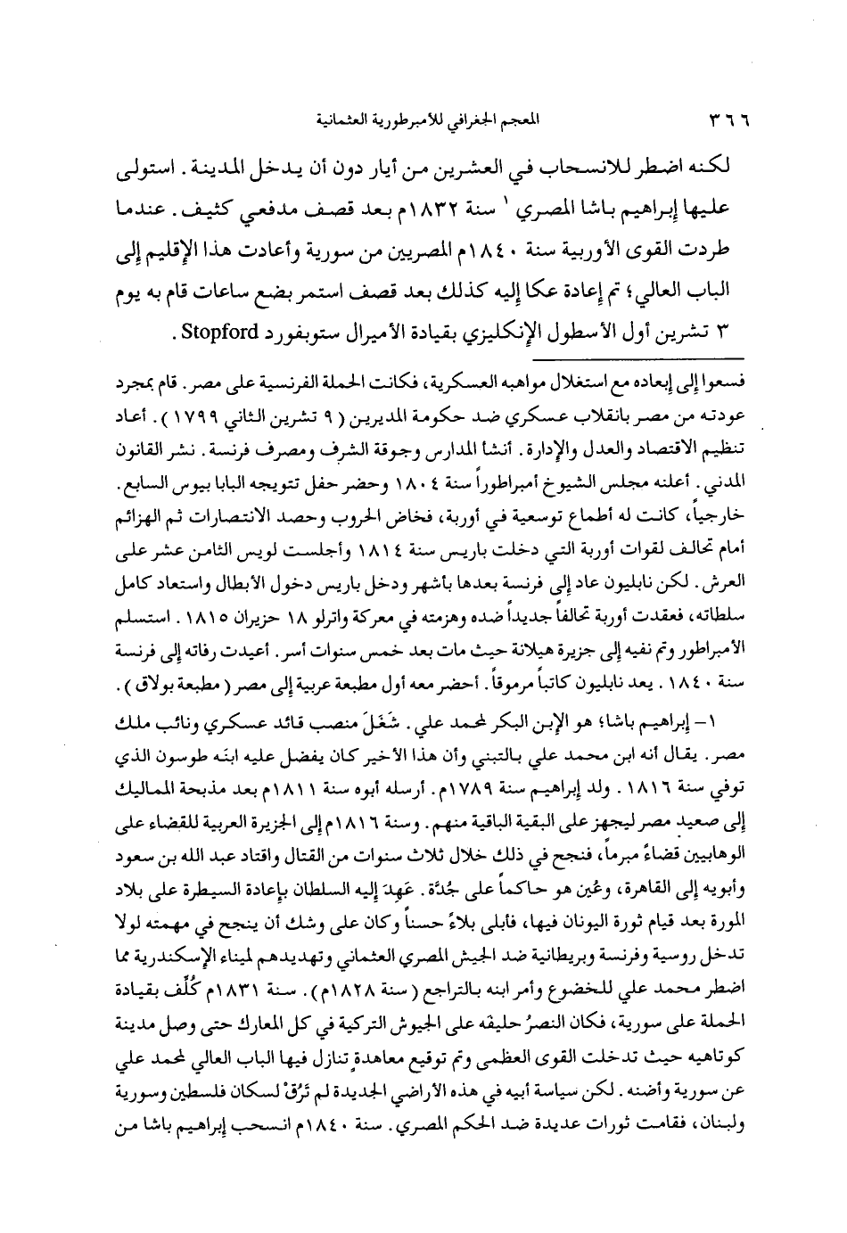 (1) إبراهيم باشا هو الإبن البكر لمحمد علي. شغل منصب قائد عسكري ونائب ملك مصر. يقال أنه ابن محمد علي بالتبني وأن هذا الأخير كان يفضل عليه ابنه طوسون الذي توفي سنة 1816. ولد إبراهيم سنة 1789م. أرسله أبوه سنة 1811م بعد مذبحة المماليك إلى صعيد مصر ليجهز على البقية الباقية منهم. وسنة 1816م إلى الجزيرة العربية للقضاء على الوهابيين قضاء مبرما، فنجح في ذلك خلال ثلاث سنوات من القتال واقتاد عبد الله بن سعود وأبويه إلى القاهرة، وعين هو حاكما على جدّة. عهد إليه السلطان بإعادة السيطرة على بلاد المورة بعد قيام ثورة اليونان فيها، فأبلى بلاء حسنا وكان على وشك أن ينجح في مهمته لولا تدخل روسية وفرنسة وبريطانية ضد الجيش المصري العثماني وتهديدهم لميناء الإسكندرية مما اضطر محمد علي للخضوع وأمر ابنه بالتراجع (سنة 1828م). سنة 1831م كلّف بقيادة الحملة على سورية، فكان النصر حليفه على الجيوش التركية في كل المعارك حتى وصل مدينة كوتاهيه حيث تدخلت القوى العظمى وتم توقيع معاهدة تنازل فيها الباب العالي لمحمد علي عن سورية وأضنه. لكن سياسة أبيه في هذه الأراضي الجديدة لم ترق لسكان فلسطين وسورية ولبنان، فقامت ثورات عديدة ضد الحكم المصري. سنة 1840م انسحب إبراهيم باشا من