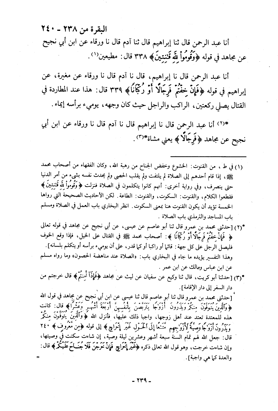 أنا عَبْدُ الرَّحْمَنِ، قَالَ: نا إِبْرَاهِيمُ، قَالَ: نا آدَمُ، قَالَ: نا وَرْقَاءُ، عَنِ ابْنِ أَبِي نَجِيحٍ، عَنْ مُجَاهِدٍ: " {§فَرِجَالًا} [البقرة: 239] "، يَعْنِي: «مُشَاةً»
