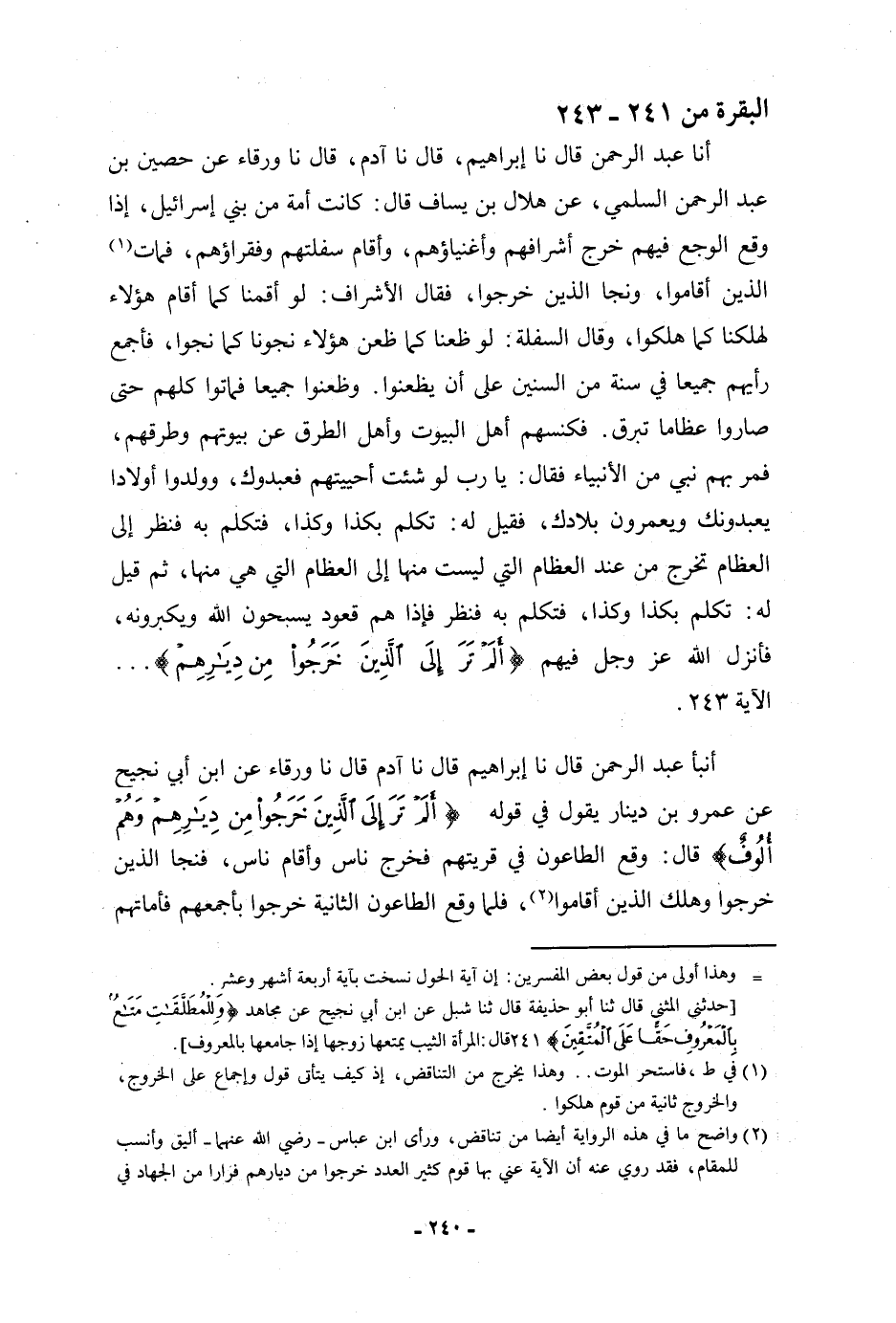أنبأ عَبْدُ الرَّحْمَنِ، قَالَ: نا إِبْرَاهِيمُ، قَالَ: نا آدَمُ، قَالَ: نا وَرْقَاءُ، عَنِ ابْنِ أَبِي نَجِيحٍ، عَنْ عَمْرِو بْنِ دِينَارٍ يَقُولُ فِي قَوْلِهِ: {أَلَمْ تَرَ إِلَى الَّذِينَ خَرَجُوا مِنْ دِيَارِهِمْ وَهُمْ أُلُوفٌ} [البقرة: 243] ، قَالَ: «§وَقَعَ الطَّاعُونُ فِي قَرْيَتِهِمْ , فَخَرَجَ نَاسٌ، وَأَقَامَ نَاسٌ، فَنَجَا الَّذِينَ خَرَجُوا , وَهَلَكَ الَّذِينَ أَقَامُوا، فَلَمَّا وَقَعَ الطَّاعُونُ الثَّانِيَةَ خَرَجُوا بِأَجْمَعِهِمْ , فَأَمَاتَهُمُ -[241]- اللَّهُ وَدَوَابَّهُمْ، ثُمَّ أَحْيَاهُمْ , فَرَجَعُوا إِلَى بِلَادِهِمْ وَقَدْ تَوَالَدَتْ ذُرِّيَّتُهُمْ وَمَنْ تَرَكُوا»