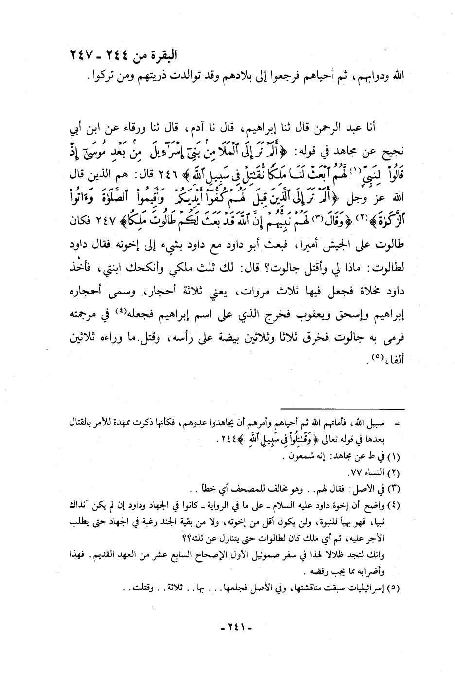 أنا عَبْدُ الرَّحْمَنِ، قَالَ: ثنا إِبْرَاهِيمُ، قَالَ: نا آدَمُ، قَالَ: ثنا وَرْقَاءُ، عَنِ ابْنِ أَبِي نَجِيحٍ، عَنْ مُجَاهِدٍ، فِي قَوْلِهِ: {أَلَمْ تَرَ إِلَى الْمَلَأِ مِنْ بَنِي إِسْرَائِيلَ مِنْ بَعْدِ مُوسَى إِذْ قَالُوا لِنَبِيٍّ لَهُمُ ابْعَثْ لَنَا مَلِكًا نُقَاتِلْ فِي سَبِيلِ اللَّهِ} ، قَالَ: " §هُمُ الَّذِينَ قَالَ اللَّهُ عَزَّ وَجَلَّ: {أَلَمْ تَرَ إِلَى الَّذِينَ قِيلَ لَهُمْ كُفُّوا أَيْدِيَكُمْ وَأَقِيمُوا الصَّلَاةَ وَآتُوا الزَّكَاةَ} [النساء: 77] ، {وَقَالَ لَهُمْ نَبِيُّهُمْ إِنَّ اللَّهَ قَدْ بَعَثَ لَكُمْ طَالُوتَ مَلِكًا} [البقرة: 247] , فَكَانَ طَالُوتُ عَلَى الْجَيْشِ أَمِيرًا , فَبَعَثَ أَبُو دَاوُدَ مَعَ دَاوُدَ بِشَيْءٍ إِلَى إِخْوَتِهِ , فَقَالَ دَاوُدُ لِطَالُوتَ: مَاذَا لِي وَأَقْتُلُ جَالُوتَ؟، قَالَ: لَكَ ثُلُثُ مُلْكِي وَأُنْكِحُكَ ابْنَتِي , فَأَخَذَ دَاوُدُ مِخْلَاةً فَجَعَلَ فِيهَا ثَلَاثَ مَرْوَاتٍ - يَعْنِي ثَلَاثَةَ أَحْجَارٍ - وَسَمَّى أَحْجَارَهُ إِبْرَاهِيمَ، وَإِسْحَاقَ، وَيَعْقُوبَ، فَخَرَجَ الَّذِي عَلَى اسْمِ إِبْرَاهِيمَ فَجَعَلَهُ فِي مِرْجَمَتِهِ فَرَمَى بِهَا جَالُوتَ فَخَرَقَ ثَلَاثًا وَثَلَاثِينَ بَيْضَةً عَلَى رَأْسِهِ , وَقَتَلَ مَا وَرَاءَهُ ثَلَاثِينَ أَلْفًا، -[242]- يَقُولُ: {وَاللَّهُ يُؤْتِي مُلْكَهُ مَنْ يَشَاءُ} [البقرة: 247] ، يَعْنِي: سُلْطَانَهُ، وَقَالَ ابْنُ أَبِي نَجِيحٍ: وَسَمِعْتُ مُجَاهِدًا يَقُولُ: أَقْبَلَتِ السَّكِينَةُ وَالصُّرَدُ وَجِبْرِيلُ عَلَيْهِ السَّلَامُ مَعَ إِبْرَاهِيمَ خَلِيلِ الرَّحْمَنِ عَزَّ وَجَلَّ مِنَ الشَّامِ، قَالَ مُجَاهِدٌ فَبَلَغَنِي أَنَّ السَّكِينَةَ لَهَا رَأْسٌ كَرَأْسِ الْهِرَّةِ وَجَنَاحَانِ