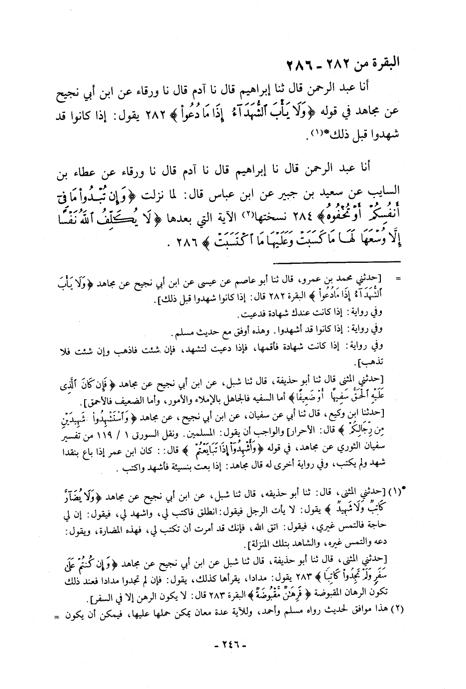 أنا عَبْدُ الرَّحْمَنِ، قَالَ: ثنا إِبْرَاهِيمُ، قَالَ: نا آدَمُ، قَالَ: نا وَرْقَاءُ، عَنِ ابْنِ أَبِي نَجِيحٍ، عَنْ مُجَاهِدٍ، فِي قَوْلِهِ: {وَلَا يَأْبَ الشُّهَدَاءُ إِذَا مَا دُعُوا} [البقرة: 282] يَقُولُ: «إِذَا §كَانُوا قَدْ شَهِدُوا قَبْلَ ذَلِكَ»