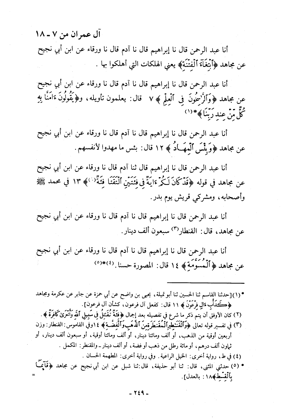 أنا عَبْدُ الرَّحْمَنِ، قَالَ: نا إِبْرَاهِيمُ، قَالَ: نا آدَمُ، قَالَ: نا وَرْقَاءُ، عَنِ ابْنِ أَبِي نَجِيحٍ، عَنْ مُجَاهِدٍ، وَالرَّاسِخُونَ فِي الْعِلْمِ قَالَ: " §يَعْلَمُونَ تَأْوِيلَهُ , وَ {يَقُولُونَ آمَنَّا بِهِ كُلٌّ مِنْ عِنْدِ رَبِّنَا} [آل عمران: 7] "