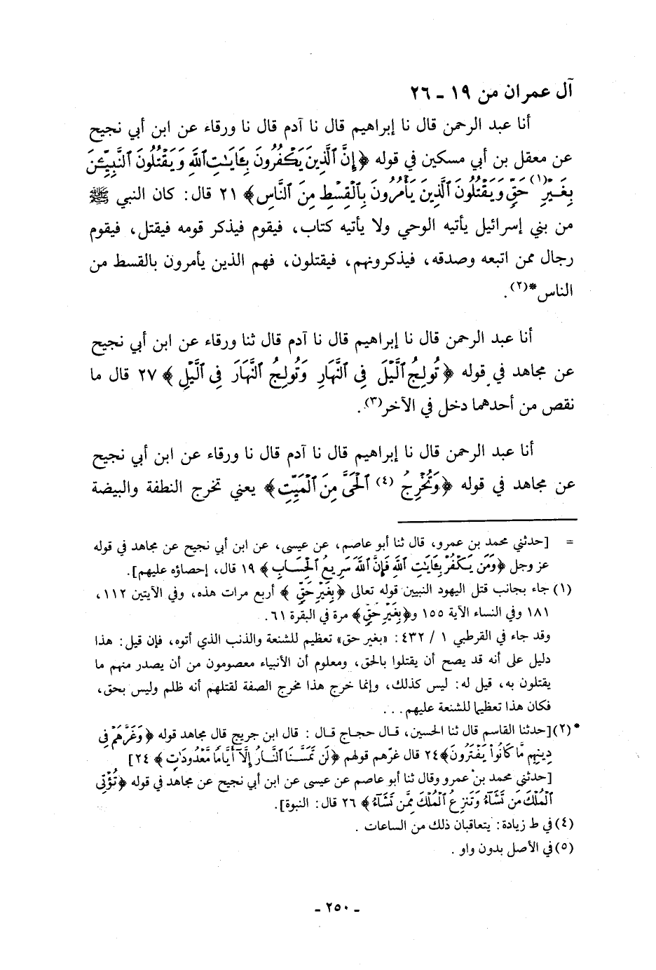 أنا عَبْدُ الرَّحْمَنِ، قَالَ: نا إِبْرَاهِيمُ، قَالَ: نا آدَمُ، قَالَ: نا وَرْقَاءُ، عَنِ ابْنِ أَبِي نَجِيحٍ، عَنْ مَعْقِلِ بْنِ أَبِي مِسْكِينٍ، فِي قَوْلِهِ: {إِنَّ الَّذِينَ يَكْفُرُونَ بِآيَاتِ اللَّهِ وَيَقْتُلُونَ النَّبِيِّينَ بِغَيْرِ حَقٍّ وَيَقْتُلُونَ الَّذِينَ يَأْمُرُونَ بِالْقِسْطِ مِنَ النَّاسِ} [آل عمران: 21] قَالَ: «كَانَ §النَّبِيُّ مِنْ بَنِي إِسْرَائِيلَ يَأْتِيهِ الْوَحْيُ وَلَا يَأْتِيهِ كِتَابٌ، فَيَقُومُ فَيُذَكِّرُ قَوْمَهُ فَيُقْتَلُ، فَيَقُومُ رِجَالٌ مِمَّنِ اتَّبَعَهُ وَصَدَّقَهُ، فَيُذَكِّرُونَهُمْ، فَيُقْتَلُونَ، فَهُمُ الَّذِينَ يَأْمُرُونَ بِالْقِسْطِ مِنَ النَّاسِ»