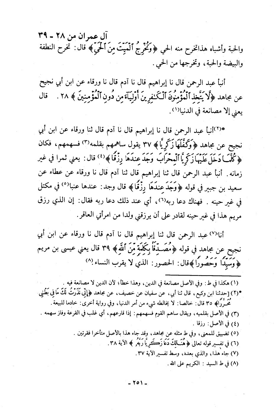 أنا عَبْدُ الرَّحْمَنِ، قَالَ: ثنا إِبْرَاهِيمُ، قَالَ: نا آدَمُ، قَالَ: نا وَرْقَاءُ، عَنِ ابْنِ أَبِي نَجِيحٍ، عَنْ مُجَاهِدٍ، فِي قَوْلِهِ: {مُصَدِّقًا بِكَلِمَةٍ مِنَ اللَّهِ} [آل عمران: 39] قَالَ: «§يَعْنِي عِيسَى ابْنَ مَرْيَمَ» ، {وَسَيِّدًا وَحَصُورًا} [آل عمران: 39] قَالَ: الْحَصُورُ: «الَّذِي لَا يَقْرَبُ النِّسَاءَ»