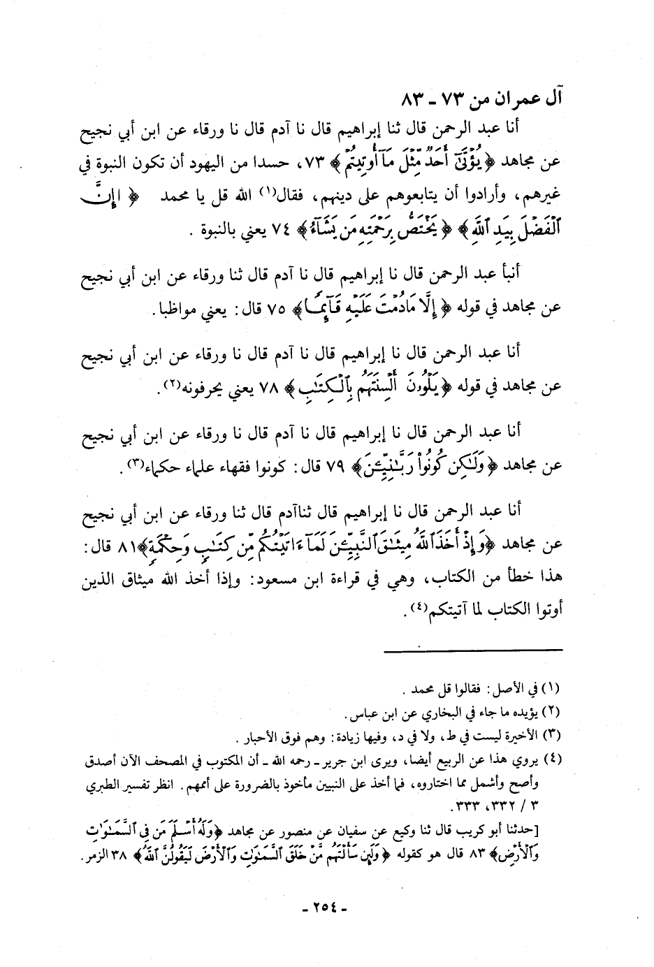 أنا عَبْدُ الرَّحْمَنِ، قَالَ: نا إِبْرَاهِيمُ، قَالَ: نا آدَمُ، قَالَ: نا وَرْقَاءُ، عَنِ ابْنِ أَبِي نَجِيحٍ، عَنْ مُجَاهِدٍ، فِي قَوْلِهِ: {§يَلْوُونَ أَلْسِنَتَهُمْ بِالْكِتَابِ} [آل عمران: 78] ، يَعْنِي: «يُحَرِّفُونَهُ»