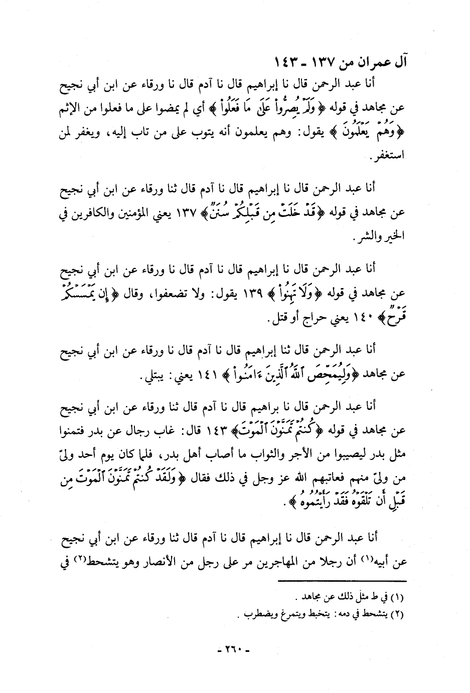 أنا عَبْدُ الرَّحْمَنِ، قَالَ: نا إِبْرَاهِيمُ، قَالَ: نا آدَمُ، قَالَ: نا وَرْقَاءُ، عَنِ ابْنِ أَبِي نَجِيحٍ، عَنْ مُجَاهِدٍ، فِي قَوْلِهِ: {§وَلَا تَهِنُوا} [آل عمران: 139] يَقُولُ: «وَلَا تَضْعُفُوا» . وَقَالَ: {إِنْ يَمْسَسْكُمْ قَرْحٌ} [آل عمران: 140] ، يَعْنِي: «جِرَاحٌ أَوْ قَتْلٌ»