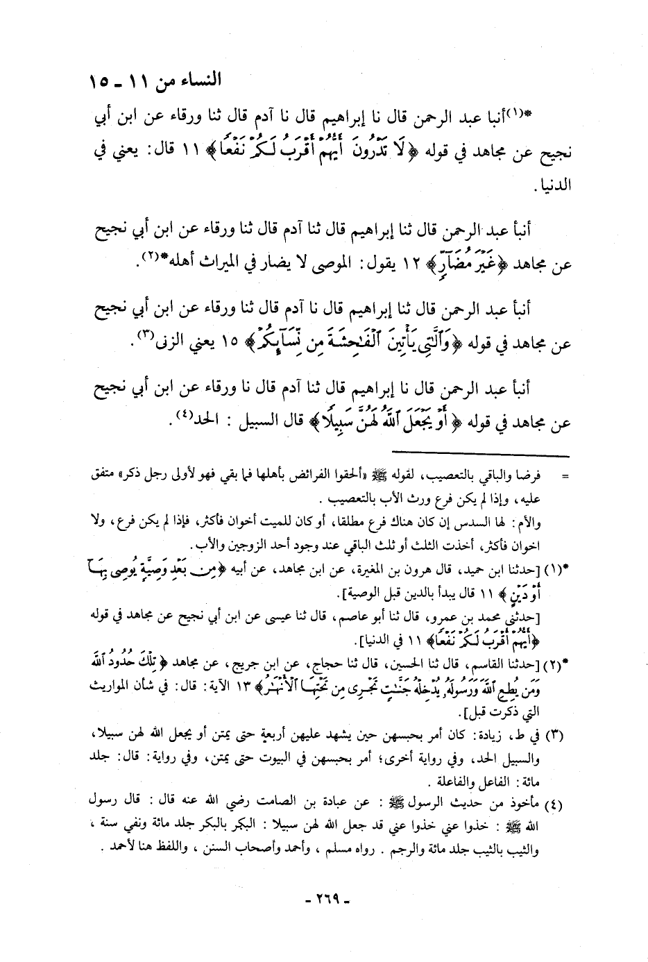 أنبأ عَبْدُ الرَّحْمَنِ، قَالَ: ثنا إِبْرَاهِيمُ، قَالَ: نا آدَمُ، قَالَ: ثنا وَرْقَاءُ، عَنِ ابْنِ أَبِي نَجِيحٍ، عَنْ مُجَاهِدٍ، فِي قَوْلِهِ: {§وَاللَّاتِي يَأْتِينَ الْفَاحِشَةَ مِنْ نسَائِكُمْ} [النساء: 15] يَعْنِي: «الزِّنَا»