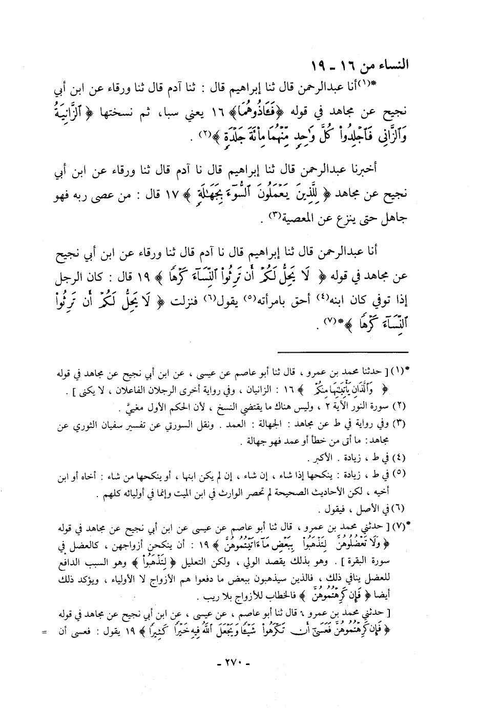 أنا عَبْدُ الرَّحْمَنِ، قَالَ: ثنا إِبْرَاهِيمُ، قَالَ: نا آدَمُ، قَالَ: ثنا وَرْقَاءُ، عَنِ ابْنِ أَبِي نَجِيحٍ، عَنْ مُجَاهِدٍ، فِي قَوْلِهِ: {لَا يَحِلُّ لَكُمْ أَنْ تَرِثُوا النِّسَاءَ كَرْهًا} [النساء: 19] قَالَ: «كَانَ §الرَّجُلُ إِذَا تُوُفِّيَ كَانَ ابْنُهُ أَحَقَّ بِامْرَأَتِهِ» يَقُولُ فَنَزَلَتْ: {لَا يَحِلُّ لَكُمْ أَنْ تَرِثُوا النِّسَاءَ كَرْهًا} [النساء: 19]