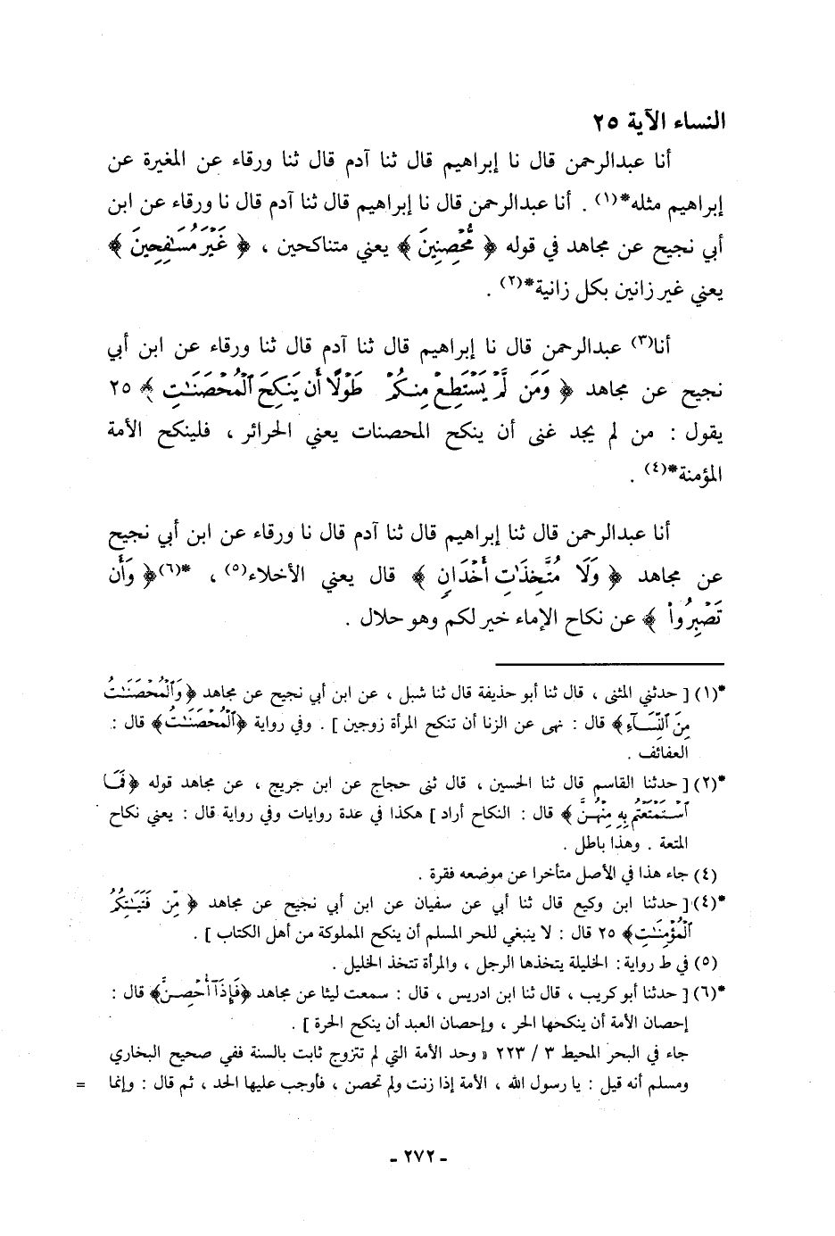 أنا عَبْدُ الرَّحْمَنِ، قَالَ: نا إِبْرَاهِيمُ، قَالَ: ثنا آدَمُ، قَالَ: ثنا وَرْقَاءُ، عَنِ ابْنِ أَبِي نَجِيحٍ، عَنْ مُجَاهِدٍ: {وَمَنْ لَمْ يَسْتَطِعْ مِنْكُمْ طَوْلًا أَنْ يَنْكِحَ الْمُحْصَنَاتِ} [النساء: 25] يَقُولُ: " §مَنْ لَمْ يَجِدْ غِنًى أَنْ يَنْكِحَ الْمُحْصَنَاتِ، يَعْنِي: الْحَرَائِرَ فَلْيَنْكِحِ الْأَمَةَ الْمُؤْمِنَةَ "