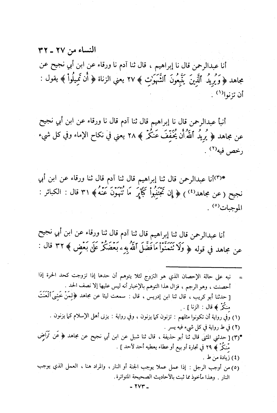 أنا عَبْدُ الرَّحْمَنِ، قَالَ: ثنا إِبْرَاهِيمُ، قَالَ: ثنا آدَمُ، قَالَ: ثنا وَرْقَاءُ، عَنِ ابْنِ أَبِي نَجِيحٍ، عَنْ مُجَاهِدٍ: {إِنْ تَجْتَنِبُوا كَبَائِرَ مَا تُنْهَوْنَ عَنْهُ} [النساء: 31] قَالَ: «§الْكَبَائِرُ الْمُوجِبَاتُ»