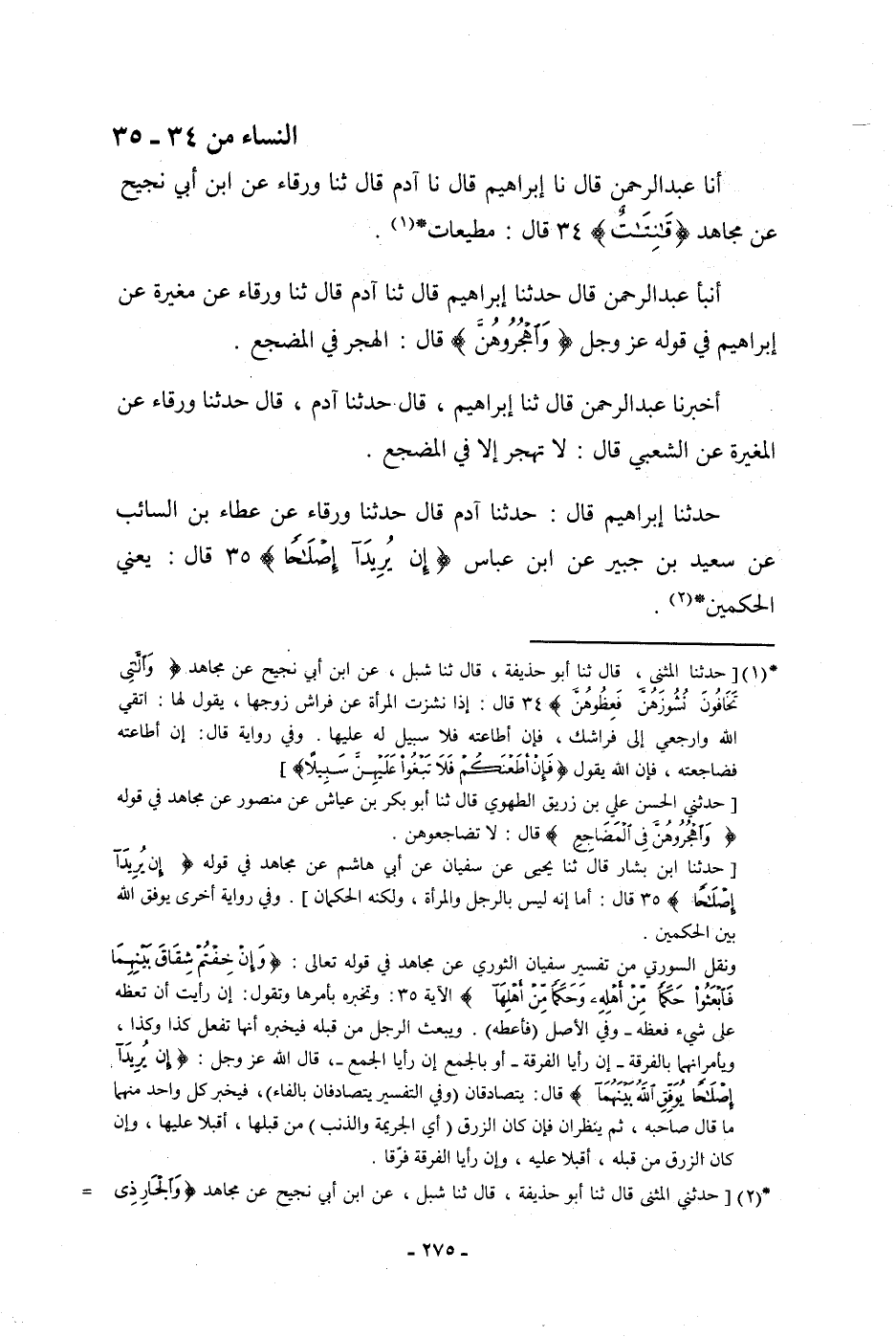 أنبأ عَبْدُ الرَّحْمَنِ، قَالَ: حَدَّثَنَا إِبْرَاهِيمُ، قَالَ: ثنا آدَمُ، قَالَ: ثنا وَرْقَاءُ، عَنْ مُغِيرَةَ، عَنْ إِبْرَاهِيمَ: فِي قَوْلِهِ عَزَّ وَجَلَّ {وَاهْجُرُوهُنَّ} [النساء: 34] ، قَالَ: «§الْهَجْرُ فِي الْمَضْجَعِ»