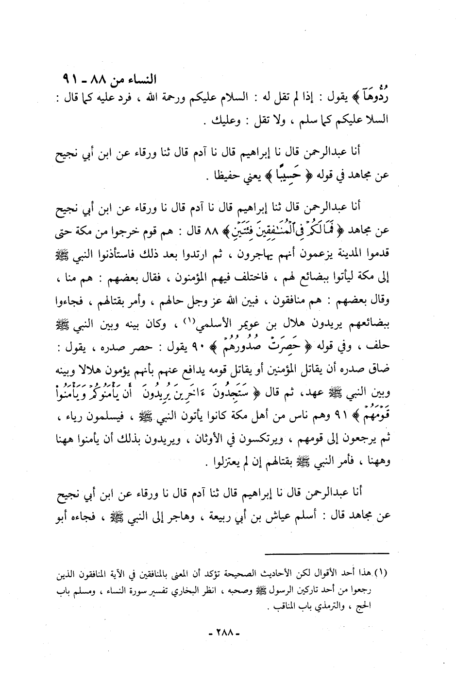 أنا عَبْدُ الرَّحْمَنِ، قَالَ: ثنا إِبْرَاهِيمُ، قَالَ: نا آدَمُ، قَالَ: نا وَرْقَاءُ، عَنِ ابْنِ أَبِي نَجِيحٍ، عَنْ مُجَاهِدٍ، {فَمَا لَكُمْ فِي الْمُنَافِقِينَ فِئَتَيْنِ} [النساء: 88] قَالَ: " §هُمْ قَوْمٌ خَرَجُوا مِنْ مَكَّةَ حَتَّى قَدِمُوا الْمَدِينَةَ يَزْعُمُونَ أَنَّهُمْ يُهَاجِرُونَ، ثُمَّ ارْتَدُّوا بَعْدَ ذَلِكَ فَاسْتَأْذَنُوا النَّبِيَّ صَلَّى اللَّهُ عَلَيْهِ وَسَلَّمَ إِلَى مَكَّةَ لِيَأْتُوا بِبِضَائِعَ لَهُمْ، فَاخْتَلَفَ فِيهِمُ الْمُؤْمِنُونَ، فَقَالَ بَعْضُهُمْ: هُمْ مِنَّا، وَقَالَ بَعْضُهُمْ: هُمْ مُنَافِقُونَ، فَبَيَّنَ اللَّهُ عَزَّ وَجَلَّ حَالَهُمْ، وَأَمَرَ بِقِتَالِهِمْ، فَجَاءُوا بِبِضَائِعِهِمْ يُرِيدُونَ هِلَالَ بْنَ عُوَيْمِرٍ الْأَسْلَمِيَّ، وَكَانَ بَيْنَهُ وَبَيْنَ النَّبِيِّ صَلَّى اللَّهُ عَلَيْهِ وَسَلَّمَ حِلْفٌ ". وَفِي قَوْلِهِ {حَصِرَتْ صُدُورُهُمْ} [النساء: 90] يَقُولُ: «حَصِرَ صَدْرُهُ» يَقُولُ: «ضَاقَ صَدْرُهُ أَنْ يُقَاتِلَ الْمُؤْمِنِينَ أَوْ يُقَاتِلَ قَوْمَهُ يُدَافِعُ عَنْهُمْ بِأَنَّهُمْ يَؤُمُّونَ هِلَالًا وَبَيْنَهُ وَبَيْنَ النَّبِيِّ صَلَّى اللَّهُ عَلَيْهِ وَسَلَّمَ عَهْدٌ» . ثُمَّ قَالَ: {سَتَجِدُونَ آخَرِينَ يُرِيدُونَ أَنْ يَأْمَنُوكُمْ وَيَأْمَنُوا قَوْمَهُمْ} [النساء: 91] «وَهُمْ نَاسٌ مِنْ أَهْلِ مَكَّةَ كَانُوا يَأْتُونَ النَّبِيَّ صَلَّى اللَّهُ عَلَيْهِ وَسَلَّمَ، فَيُسْلِمُونَ رِيَاءً، ثُمَّ يَرْجِعُونَ إِلَى قَوْمِهِمْ، وَيَرْتَكِسُونَ فِي الْأَوْثَانِ، وَيُرِيدُونَ بِذَلِكَ أَنْ يَأْمَنُوا هَهُنَا وَهَهُنَا، فَأَمَرَ النَّبِيُّ صَلَّى اللَّهُ عَلَيْهِ وَسَلَّمَ بِقِتَالِهِمْ إِنْ لَمْ يَعْتَزِلُوا»