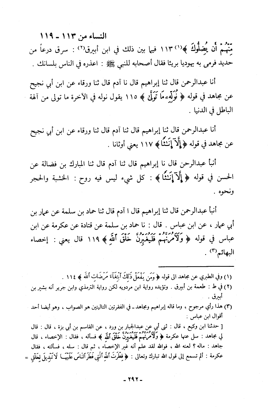 أنبأ عَبْدُ الرَّحْمَنِ، قَالَ: ثنا إِبْرَاهِيمُ، قَالَ: نا آدَمُ، قَالَ: ثنا حَمَّادُ بْنُ سَلَمَةَ، عَنْ عَمَّارِ بْنِ أَبِي عَمَّارٍ، عَنِ ابْنِ عَبَّاسٍ. قَالَ: نا حَمَّادُ بْنُ سَلَمَةَ، عَنْ قَتَادَةَ، عَنْ عِكْرِمَةَ، عَنِ ابْنِ عَبَّاسٍ، فِي قَوْلِهِ: {§وَلَآمُرَنَّهُمْ فَلَيُغَيِّرُنَّ خَلْقَ اللَّهِ} [النساء: 119] يَعْنِي: «إِخْصَاءَ الْبَهَائِمِ» . -[293]- أنا عَبْدُ الرَّحْمَنِ، قَالَ: ثنا إِبْرَاهِيمُ، قَالَ: حَدَّثَنَا آدَمُ، قَالَ: ثنا وَرْقَاءُ، عَنْ مُغِيرَةَ، عَنْ إِبْرَاهِيمَ، قَالَ: «يَعْنِي دِينَ اللَّهِ عَزَّ وَجَلَّ» . أنا عَبْدُ الرَّحْمَنِ، قَالَ: ثنا إِبْرَاهِيمُ، قَالَ: نا آدَمُ، قَالَ: نا أَبُو جَعْفَرٍ الرَّازِيُّ، عَنْ مُغِيرَةَ، عَنْ إِبْرَاهِيمَ، مِثْلَهُ