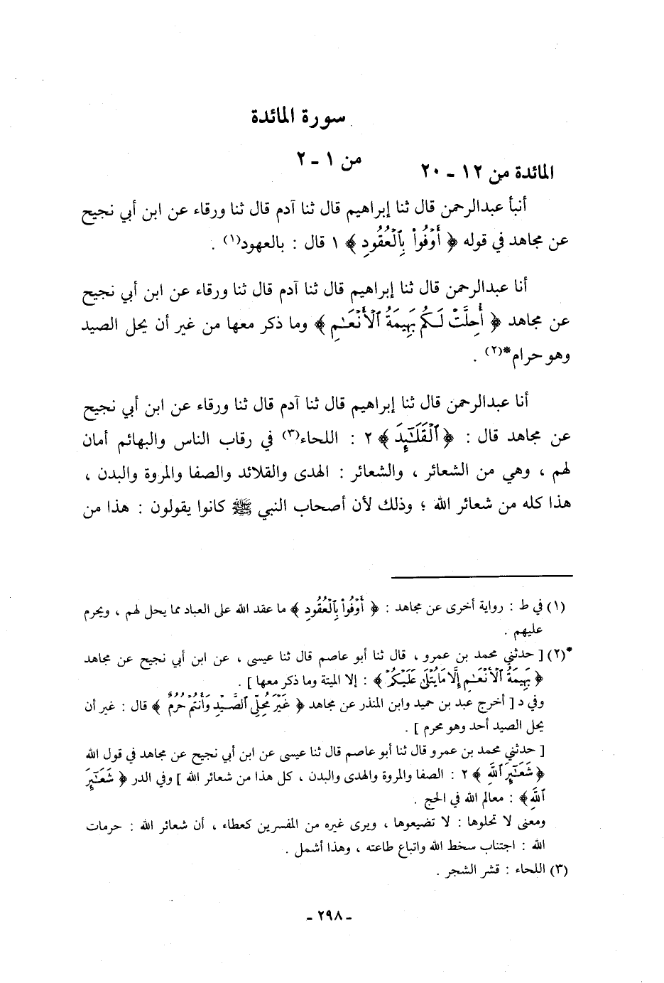 أنا عَبْدُ الرَّحْمَنِ، قَالَ: ثنا إِبْرَاهِيمُ، قَالَ: ثنا آدَمُ، قَالَ: ثنا وَرْقَاءُ، عَنِ ابْنِ أَبِي نَجِيحٍ، عَنْ مُجَاهِدٍ، قَالَ: {الْقَلَائِدَ} [المائدة: 2] " §اللِّحَاءُ فِي رِقَابِ النَّاسِ وَالْبَهَائِمِ أَمَانٌ لَهُمْ، وَهِيَ مِنَ الشَّعَائِرِ، وَالشَّعَائِرُ: الْهَدْيُ، وَالْقَلَائِدُ: وَالصَّفَا وَالْمَرْوَةُ وَالْبُدْنُ، هَذَا كُلُّهُ مِنْ شَعَائِرِ اللَّهِ، وَذَلِكَ لِأَنَّ أَصْحَابَ النَّبِيِّ صَلَّى اللَّهُ عَلَيْهِ وَسَلَّمَ كَانُوا يَقُولُونَ هَذَا مِنْ -[299]- عَمَلِ الْجَاهِلِيَّةِ فِعْلُهُ وَإِقَامَتُهُ، وَأُحِلَّ ذَلِكَ كُلُّهُ بِالْإِسْلَامِ إِلَّا الْقَلَائِدَ اللِّحَاءَ فَإِنَّهُ تَرْكٌ "