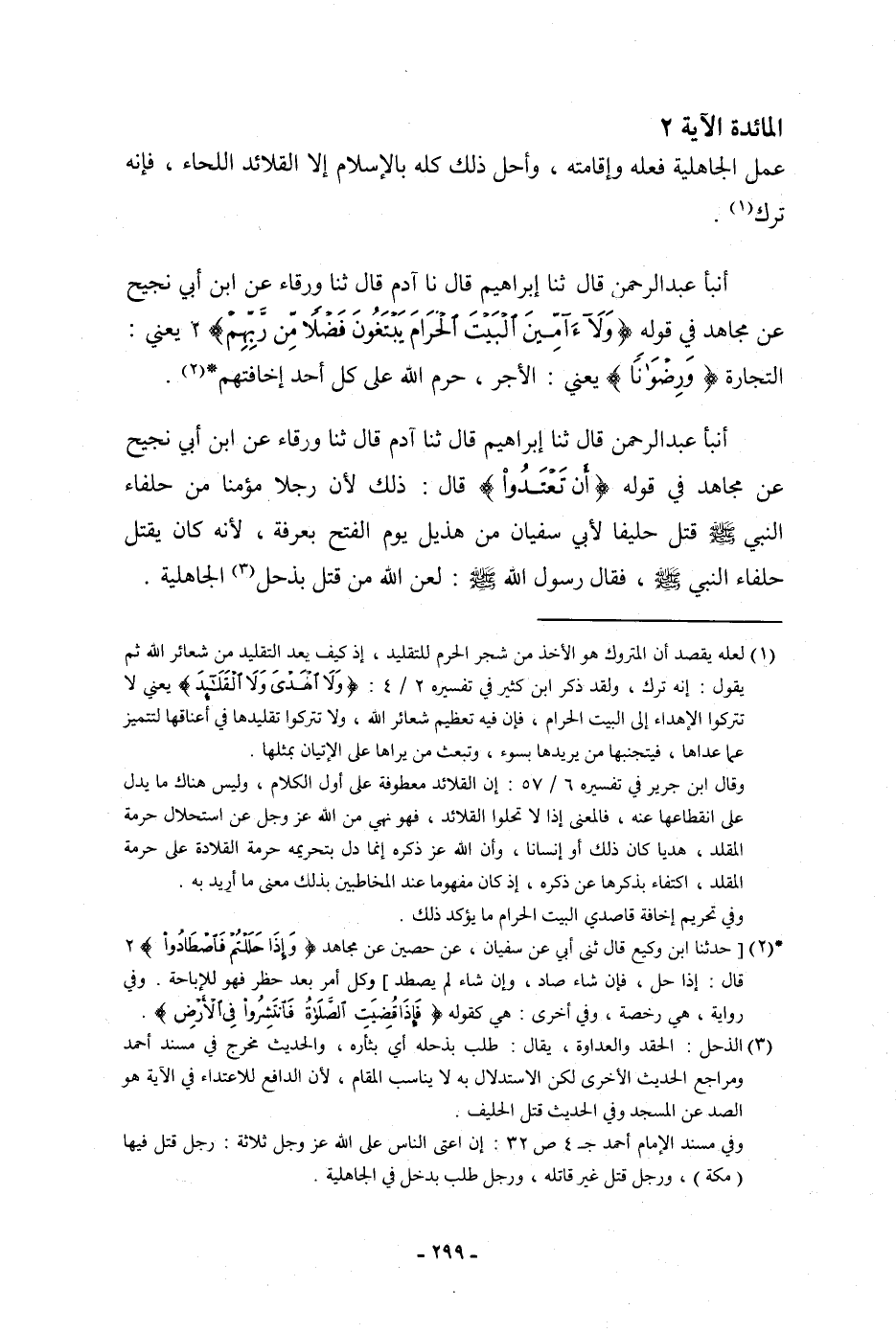 أنبأ عَبْدُ الرَّحْمَنِ، قَالَ: ثنا إِبْرَاهِيمُ، قَالَ: نا آدَمُ، قَالَ: ثنا وَرْقَاءُ، عَنِ ابْنِ أَبِي نَجِيحٍ، عَنْ مُجَاهِدٍ، فِي قَوْلِهِ {§وَلَا آمِّينَ الْبَيْتَ الْحَرَامَ يَبْتَغُونَ فَضْلًا مِنْ رَبِّهِمْ} [المائدة: 2] يَعْنِي: «التِّجَارَةَ» ، {وَرِضْوانًا} [المائدة: 2] يَعْنِي: «الْأَجْرَ، حَرَّمَ اللَّهُ عَلَى كُلِّ أَحَدٍ إِخَافَتَهُمْ»
