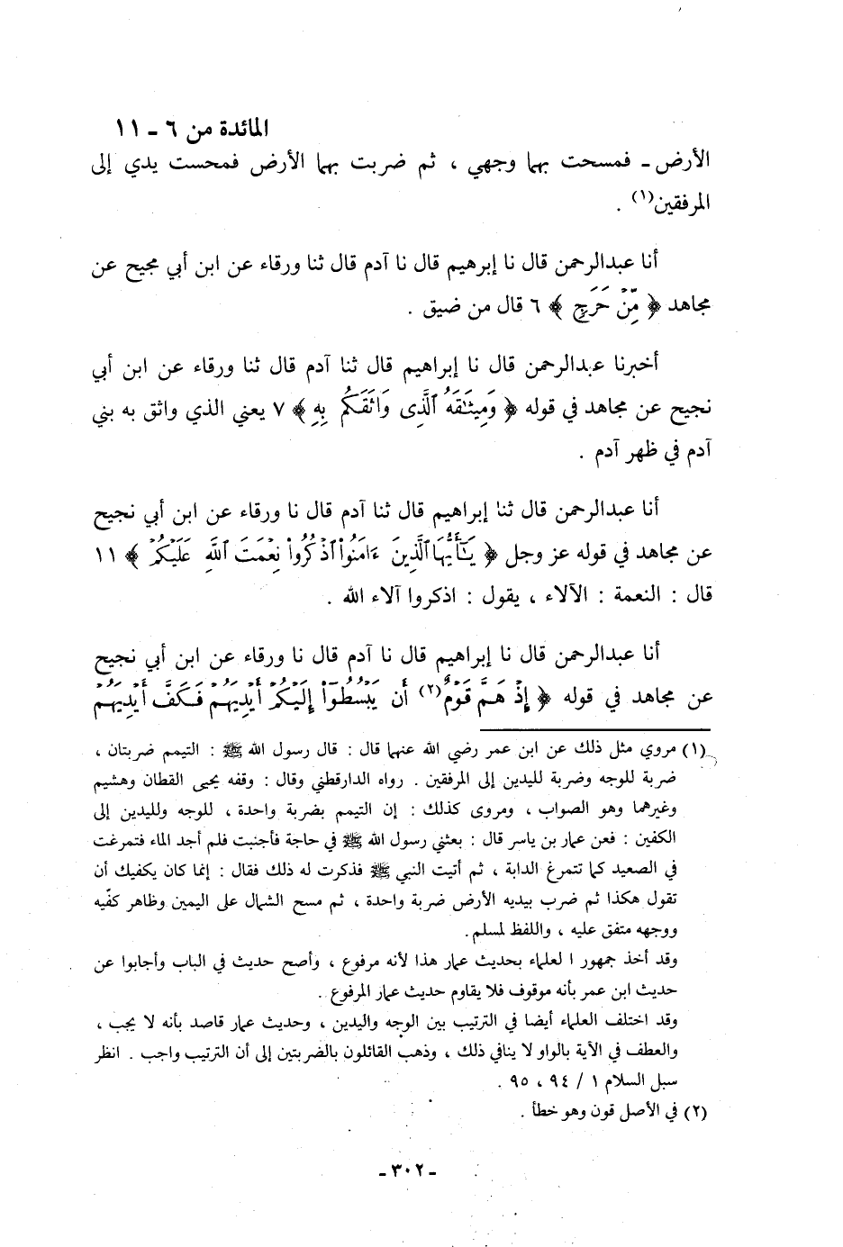 أنا عَبْدُ الرَّحْمَنِ، قَالَ: نا إِبْرَاهِيمُ، قَالَ: نا آدَمُ، قَالَ: ثنا وَرْقَاءُ، عَنِ ابْنِ أَبِي نَجِيحٍ، عَنْ مُجَاهِدٍ: {§مِنْ حَرَجٍ} [المائدة: 6] قَالَ: «مِنْ ضِيقٍ»