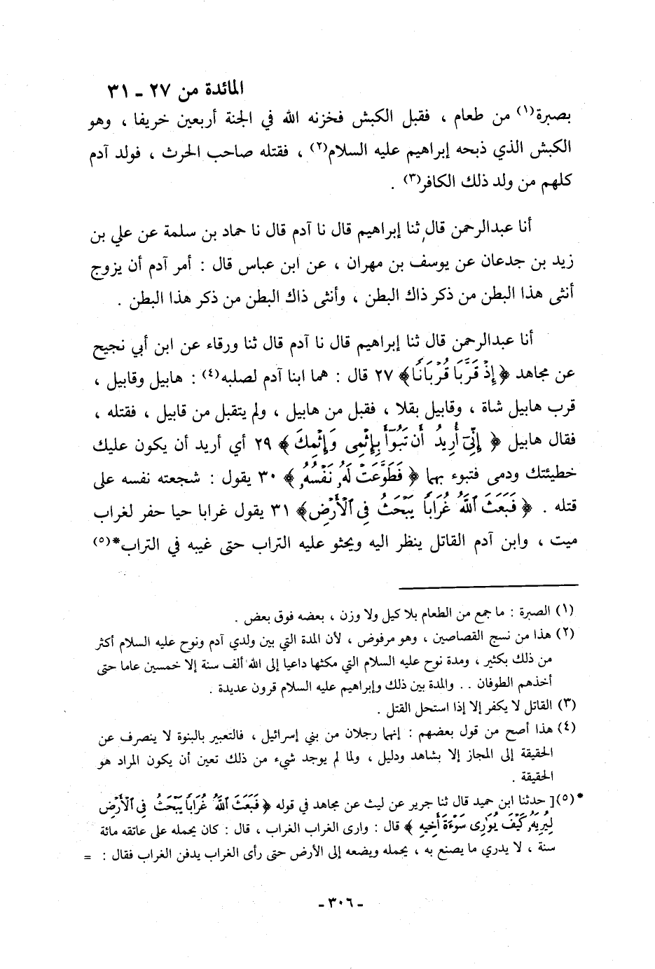 أنا عَبْدُ الرَّحْمَنِ، قَالَ: ثنا إِبْرَاهِيمُ، قَالَ: نا آدَمُ، قَالَ: ثنا وَرْقَاءُ، عَنِ ابْنِ أَبِي نَجِيحٍ، عَنْ مُجَاهِدٍ، {إِذْ قَرَّبَا قُرْبَانًا} [المائدة: 27] قَالَ: " §هُمَا ابْنَا آدَمَ لِصُلْبِهِ هَابِيلُ وَقَابِيلُ، قَرَّبَ هَابِيلُ شَاةً، وَقَابِيلُ بَقْلًا، فَقُبِلَ مِنْ هَابِيلَ وَلَمْ يُتَقَبَّلُ مِنْ قَابِيلِ، فَقَتَلَهُ، فَقَالَ هَابِيلُ: {إِنِّي أُرِيدُ أَنْ تَبُوءَ بِإِثْمِي وَإِثْمِكَ} [المائدة: 29] «أَيْ أُرِيدُ أَنْ يَكُونَ عَلَيْكَ خَطِيئَتُكَ وَدَمِي فَتَبُوءَ بِهِمَا» ، {فَطَوَّعْتُ لَهُ نَفْسُهُ} [المائدة: 30] يَقُولُ: «شَجَّعَتْهُ نَفْسُهُ عَلَى قَتْلِهِ» ، {فَبَعَثَ اللَّهُ غُرَابًا يَبْحَثَ فِي الْأَرْضِ} [المائدة: 31] يَقُولُ: " غُرَابًا حَيًّا حَفَرَ لِغُرَابٍ مَيِّتٍ، وَابْنُ آدَمَ الْقَاتِلُ يَنْظُرُ إِلَيْهِ وَيَحْثُو عَلَيْهِ التُّرَابَ حَتَّى غَيَّبَهُ فِي التُّرَابِ. -[307]- يَقُولُ اللَّهُ عَزَّ وَجَلَّ: {مَنْ قَتَلَ نَفْسًا بِغَيْرِ نَفْسٍ أَوْ فَسَادٍ فِي الْأَرْضِ فَكَأَنَّمَا قَتَلَ النَّاسَ جَمِيعًا} [المائدة: 32] قَالَ: هَذَا مِثْلُ قَوْلِهِ {وَمَنْ يَقْتُلْ مُؤْمِنًا مُتَعَمِّدًا فَجَزَاؤُهُ جَهَنَّمُ خَالِدًا فِيهَا} [النساء: 93]