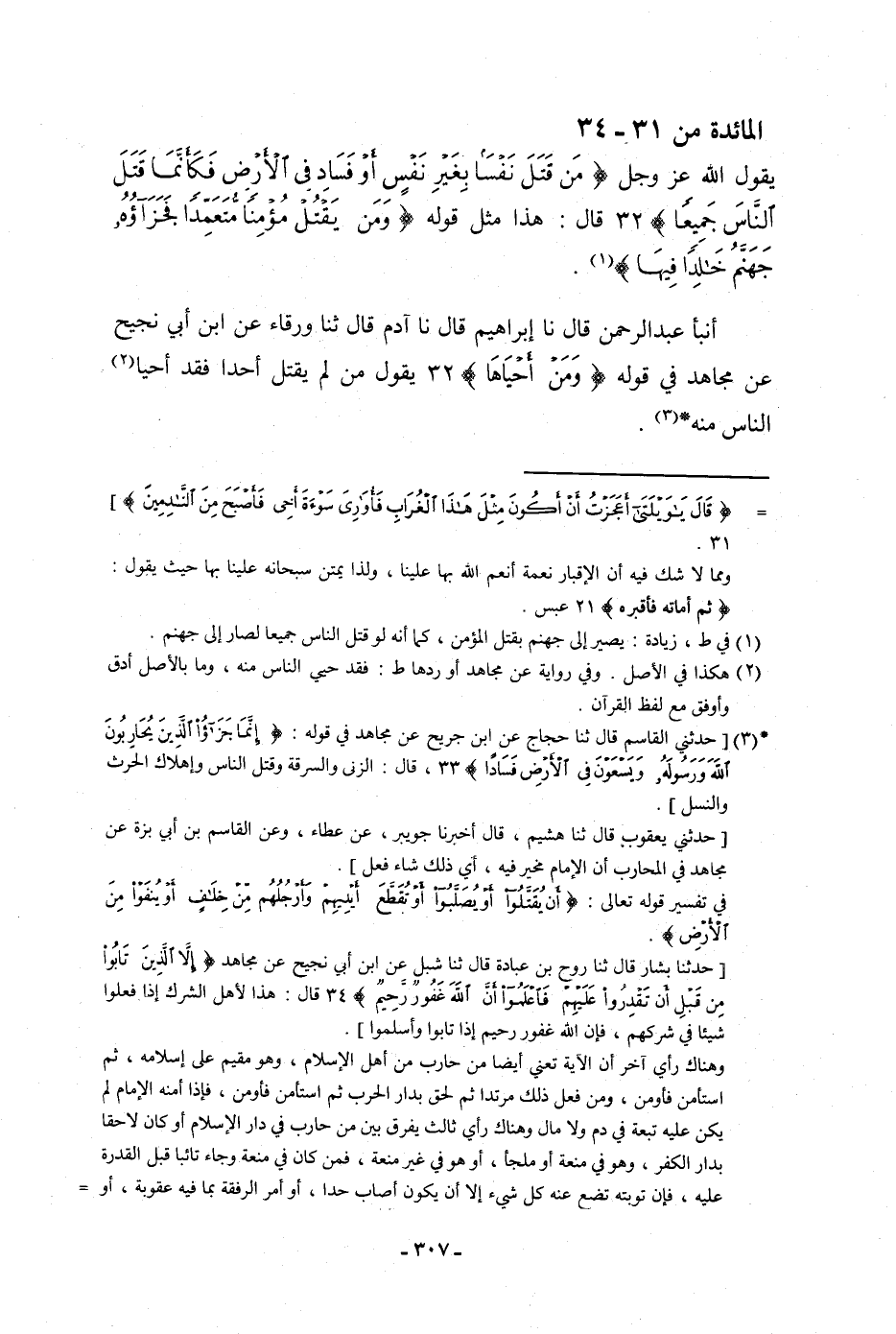 أنبأ عَبْدُ الرَّحْمَنِ، قَالَ: نا إِبْرَاهِيمُ، قَالَ: نا آدَمُ، قَالَ: ثنا وَرْقَاءُ، عَنِ ابْنِ أَبِي نَجِيحٍ، عَنْ مُجَاهِدٍ، فِي قَوْلِهِ: {وَمَنْ أَحْيَاهَا} [المائدة: 32] يَقُولُ: «§مَنْ لَمْ يَقْتُلْ أَحَدًا فَقَدْ أَحْيَا النَّاسَ مِنْهُ»