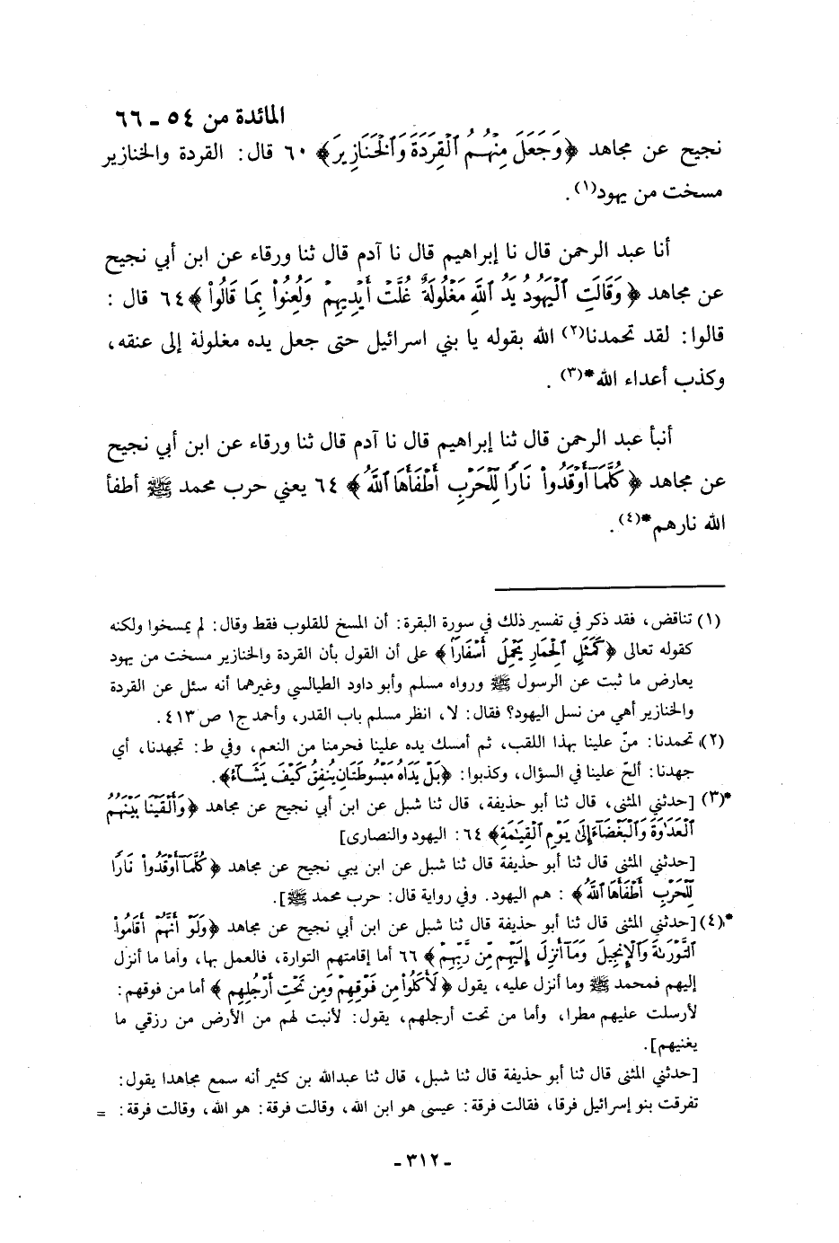 أنبأ عَبْدُ الرَّحْمَنِ، قَالَ: ثنا إِبْرَاهِيمُ، قَالَ: نا آدَمُ، قَالَ: ثنا وَرْقَاءُ، عَنِ ابْنِ أَبِي نَجِيحٍ، عَنْ مُجَاهِدٍ: {كُلَّمَا أَوْقَدُوا نَارًا لِلْحَرْبِ أَطْفَأَهَا اللَّهُ} [المائدة: 64] " يَعْنِي: «§حَرْبَ مُحَمَّدٍ صَلَّى اللَّهُ عَلَيْهِ وَسَلَّمَ أَطْفَأَ اللَّهُ نَارَهُمْ»
