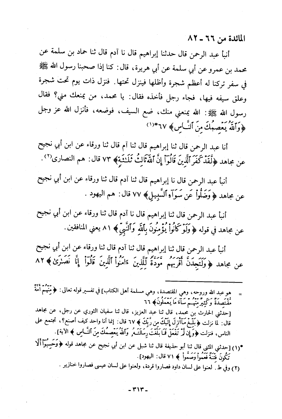 أنبأ عَبْدُ الرَّحْمَنِ، قَالَ: ثنا إِبْرَاهِيمُ، قَالَ: نا آدَمُ، قَالَ: ثنا وَرْقَاءُ، عَنِ ابْنِ أَبِي نَجِيحٍ، عَنْ مُجَاهِدٍ، فِي قَوْلِهِ: {§وَلَوْ كَانُوا يُؤْمِنُونَ بِاللَّهِ وَالنَّبِيِّ} [المائدة: 81] «يَعْنِي الْمُنَافِقِينَ»