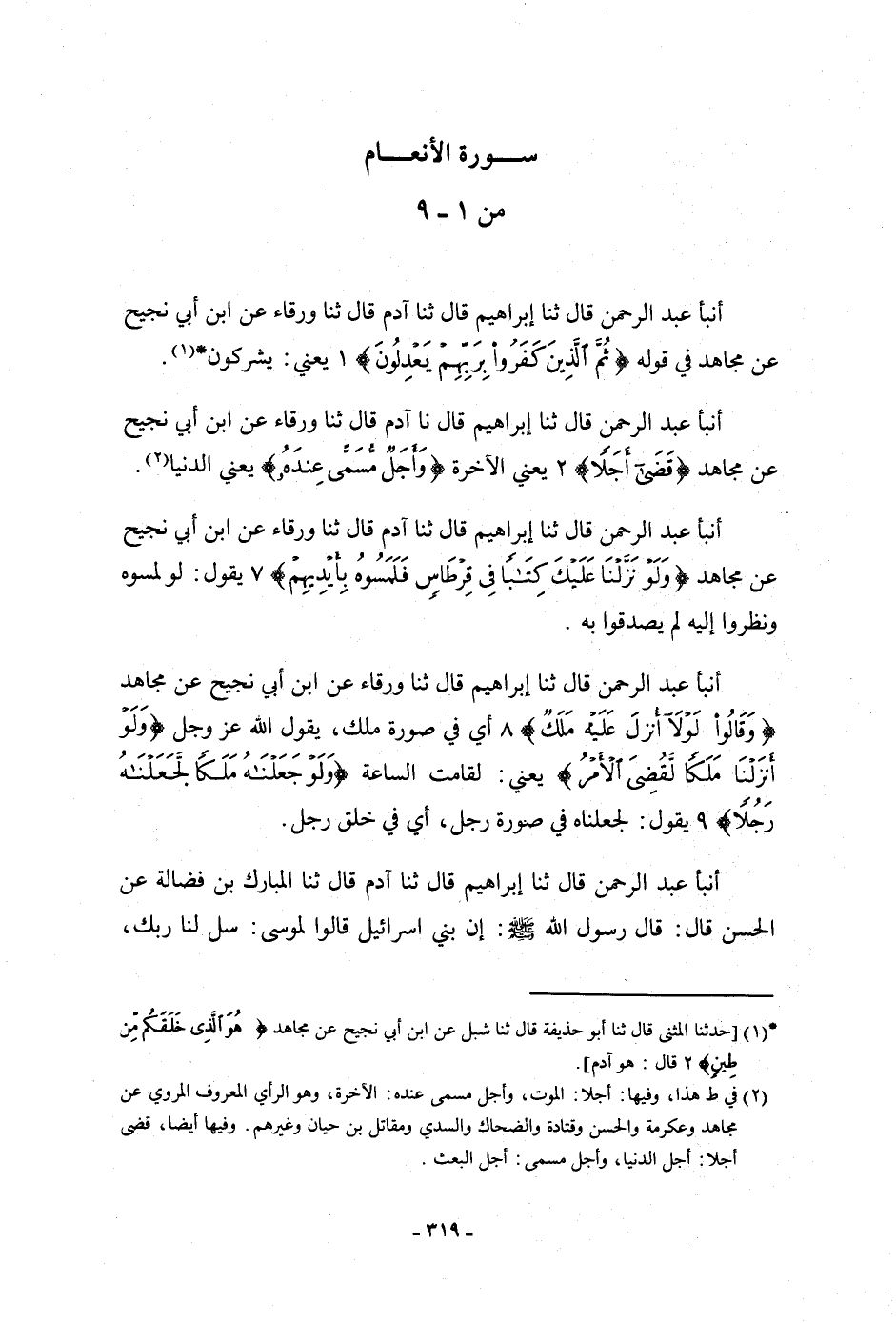 أنبأ عَبْدُ الرَّحْمَنِ، قَالَ: ثنا إِبْرَاهِيمُ، قَالَ: ثنا آدَمُ، قَالَ: ثنا وَرْقَاءُ، عَنْ ابْنِ أَبِي نَجِيحٍ، عَنْ مُجَاهِدٍ وَقَالُوا: {§لَوْلَا أُنْزِلَ عَلَيْهِ مَلَكٌ} [الأنعام: 8] أَيْ: «فِي صُورَةِ مَلَكٍ» ، يَقُولُ اللَّهُ عَزَّ وَجَلَّ: {وَلَوْ أَنْزَلْنَا مَلَكًا لَقُضِيَ الْأَمْرُ} [الأنعام: 8] «يَعْنِي لَقَامَتِ السَّاعَةُ» {وَلَوْ جَعَلْنَاهُ مَلَكًا لَجَعَلْنَاهُ رَجُلًا} [الأنعام: 9] يَقُولُ: «لَجَعَلْنَاهُ فِي صُورَةِ رَجُلٍ، أَيْ فِي خَلْقِ رَجُلٍ»