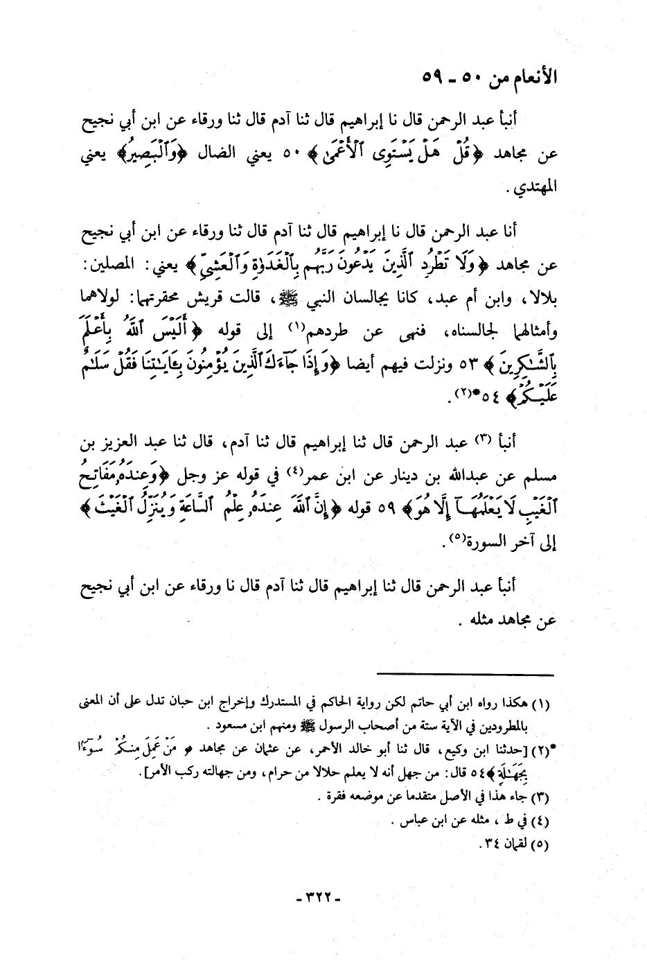 أنا عَبْدُ الرَّحْمَنِ، قَالَ: نا إِبْرَاهِيمُ، قَالَ: ثنا آدَمُ، قَالَ: ثنا وَرْقَاءُ، عَنِ ابْنِ أَبِي نَجِيحٍ، عَنْ مُجَاهِدٍ: {وَلَا تَطْرُدِ الَّذِينَ يَدْعُونَ رَبَّهُمْ بِالْغَدَاةِ وَالْعَشِيِّ} [الأنعام: 52] يَعْنِي: " §الْمُصَلِّينَ بِلَالًا، وَابْنَ أُمِّ عَبْدٍ كَانَا يُجَالِسَانِ النَّبِيَّ صَلَّى اللَّهُ عَلَيْهِ وَسَلَّمَ، قَالَتْ قُرَيْشٌ مُحَقِّرَتَهُمَا: لَوْلَاهُمَا وَأَمْثَالُهُمَا لَجَالَسْنَاهُ، فَنُهِيَ عَنْ طَرْدِهِمْ " إِلَى قَوْلِهِ {أَلَيْسَ اللَّهُ بِأَعْلَمَ بِالشَّاكِرِينَ} [الأنعام: 53] وَنَزَلَتْ فِيهِمْ أَيْضًا {وَإِذَا جَاءَكَ الَّذِينَ يُؤْمِنُونَ بِآيَاتِنَا فَقُلْ سَلَامٌ عَلَيْكُمْ} [الأنعام: 54]