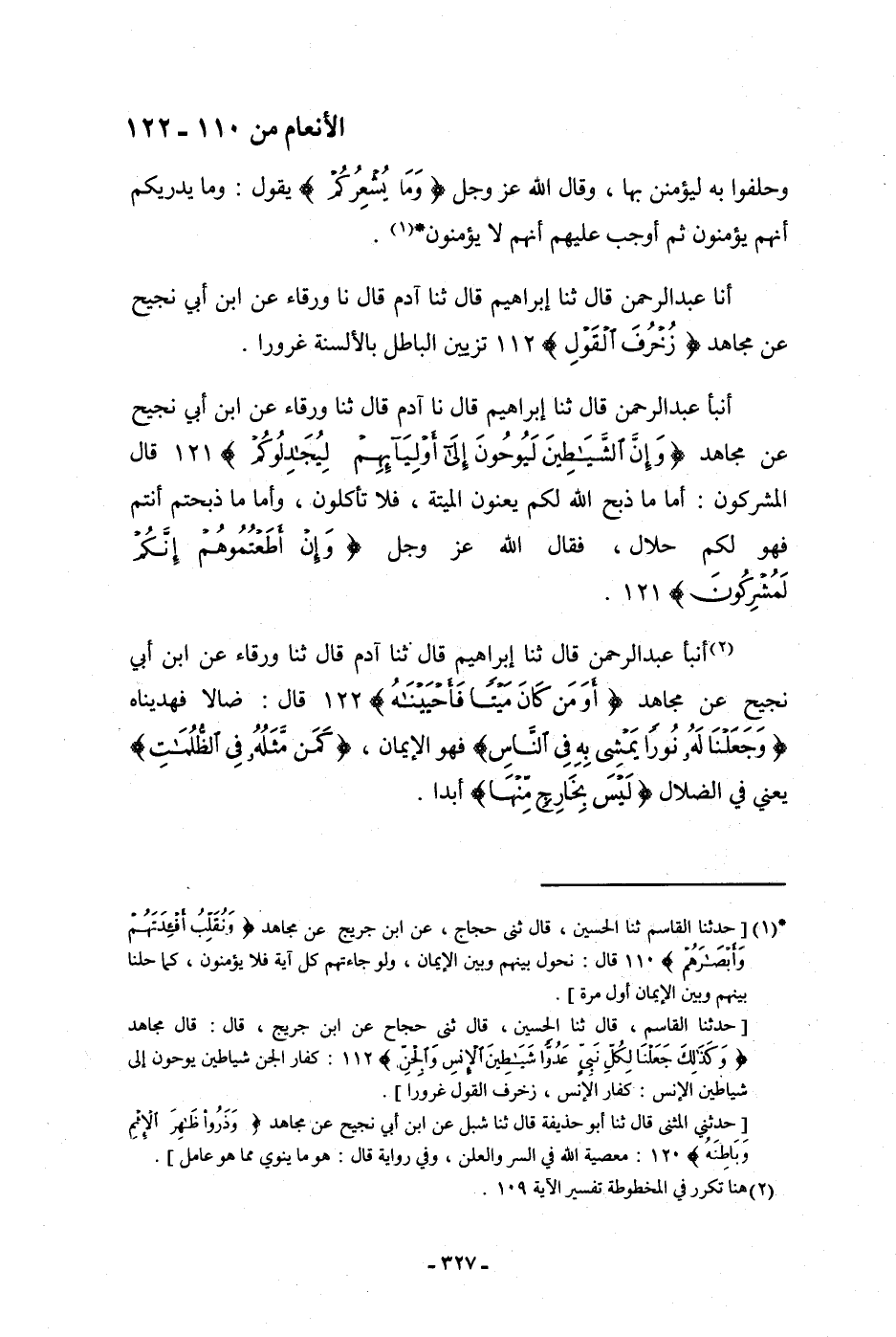 أنبأ عَبْدُ الرَّحْمَنِ، قَالَ: ثنا إِبْرَاهِيمُ، قَالَ: نا آدَمُ، قَالَ: ثنا وَرْقَاءُ، عَنِ ابْنِ أَبِي نَجِيحٍ، عَنْ مُجَاهِدٍ: {§وَإِنَّ الشَّيَاطِينَ لَيُوحُونَ إِلَى أَوْلِيَائِهِمْ لِيُجَادِلُوكُمْ} [الأنعام: 121] ، قَالَ الْمُشْرِكُونَ: أَمَّا مَا ذَبَحَ اللَّهُ لَكُمْ، يَعْنُونَ الْمَيْتَةَ، فَلَا تَأْكُلُونَ، وَأَمَّا مَا ذَبَحْتُمْ أَنْتُمْ فَهُوَ لَكُمْ حَلَالٌ "، فَقَالَ اللَّهُ عَزَّ وَجَلَّ: {وَإِنْ أَطَعْتُمُوهُمْ إِنَّكُمْ لَمُشْرِكُونَ} [الأنعام: 121]
