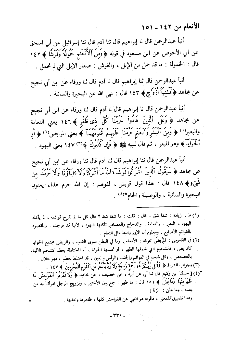 أنبأ عَبْدُ الرَّحْمَنِ، قَالَ: ثنا إِبْرَاهِيمُ، قَالَ: ثنا آدَمُ، قَالَ: ثنا وَرْقَاءُ، عَنِ ابْنِ أَبِي نَجِيحٍ، عَنْ مُجَاهِدٍ: {سَيَقُولُ الَّذِينَ أَشْرَكُوا لَوْ شَاءَ اللَّهُ مَا أَشْرَكْنَا، وَلَا آبَاؤُنَا، وَلَا حَرَّمْنَا مِنْ شَيْءٍ} [الأنعام: 148] قَالَ: " §هَذَا قَوْلُ قُرَيْشٍ لِقَوْلِهِمْ: إِنَّ اللَّهَ حَرَّمَ هَذَا يَعْنُونَ الْبَحِيرَةَ، وَالسَّائِبَةَ، وَالْوَصِيلَةَ، وَالْحَامَ "