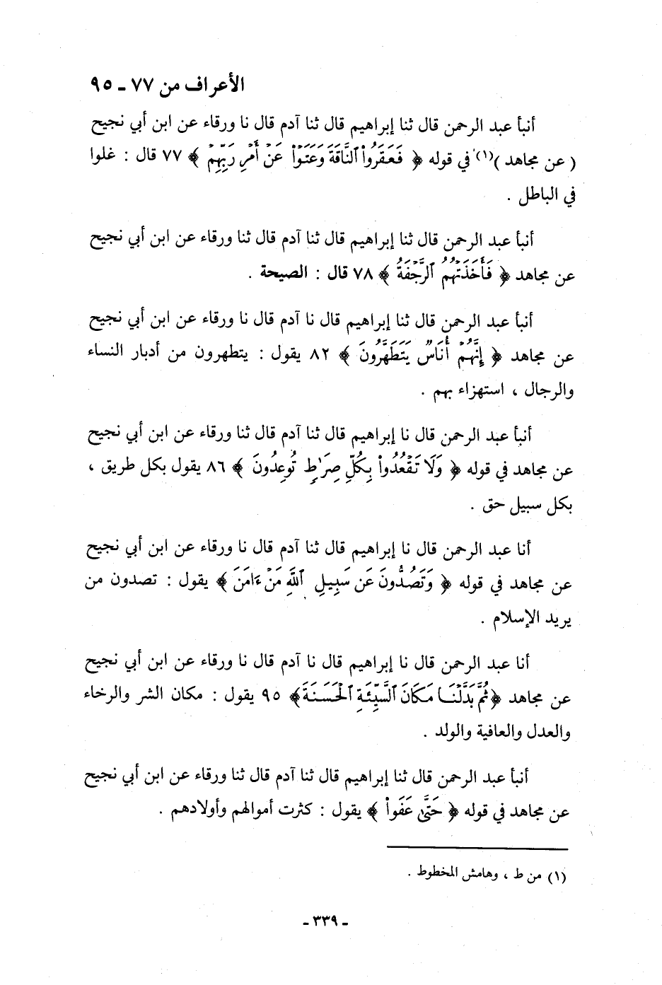 أنا عَبْدُ الرَّحْمَنِ، قَالَ: نا إِبْرَاهِيمُ، قَالَ: ثنا آدَمُ، قَالَ: نا وَرْقَاءُ، عَنِ ابْنِ أَبِي نَجِيحٍ، عَنْ مُجَاهِدٍ، فِي قَوْلِهِ: {وَتَصُدُّونَ عَنْ سَبِيلِ اللَّهِ مَنْ آمَنَ} [الأعراف: 86] ، يَقُولُ: «§تَصُدُّونَ مَنْ يُرِيدُ الْإِسْلَامَ»