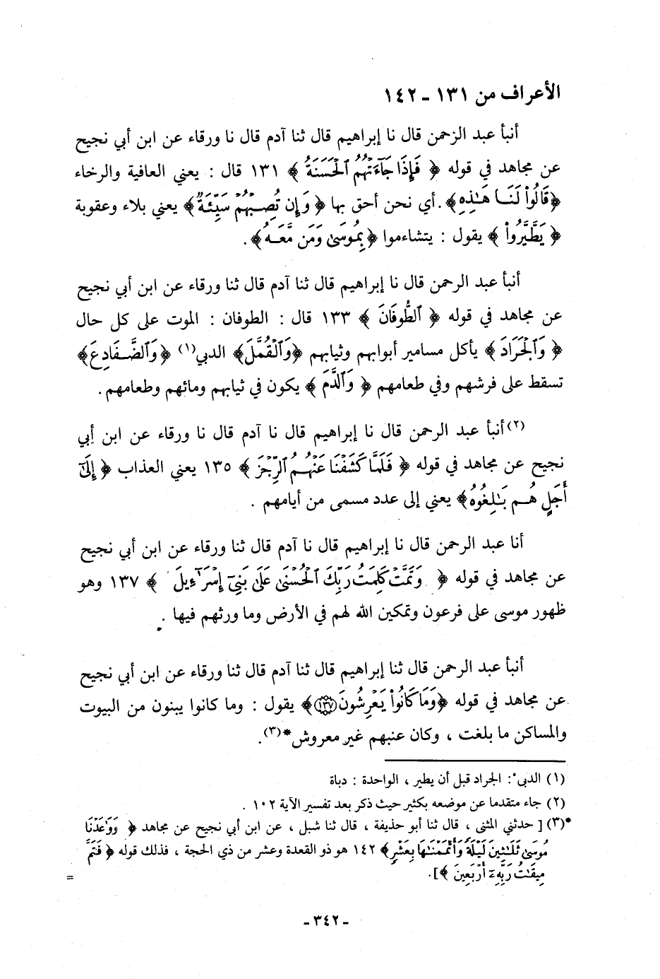 أنبأ عَبْدُ الرَّحْمَنِ، قَالَ: نا إِبْرَاهِيمُ، قَالَ: نا آدَمُ، قَالَ: نا وَرْقَاءُ، عَنِ ابْنِ أَبِي نَجِيحٍ، عَنْ مُجَاهِدٍ، فِي قَوْلِهِ: {فَلَمَّا كَشَفْنَا عَنْهُمُ الرِّجْزَ} [الأعراف: 135] ، قَالَ: «يَعْنِي §الْعَذَابَ إِلَى أَجَلٍ هُمْ بَالِغُوهُ يَعْنِي إِلَى عَدَدٍ مُسَمًّى مِنْ أَيَّامِهِمْ»