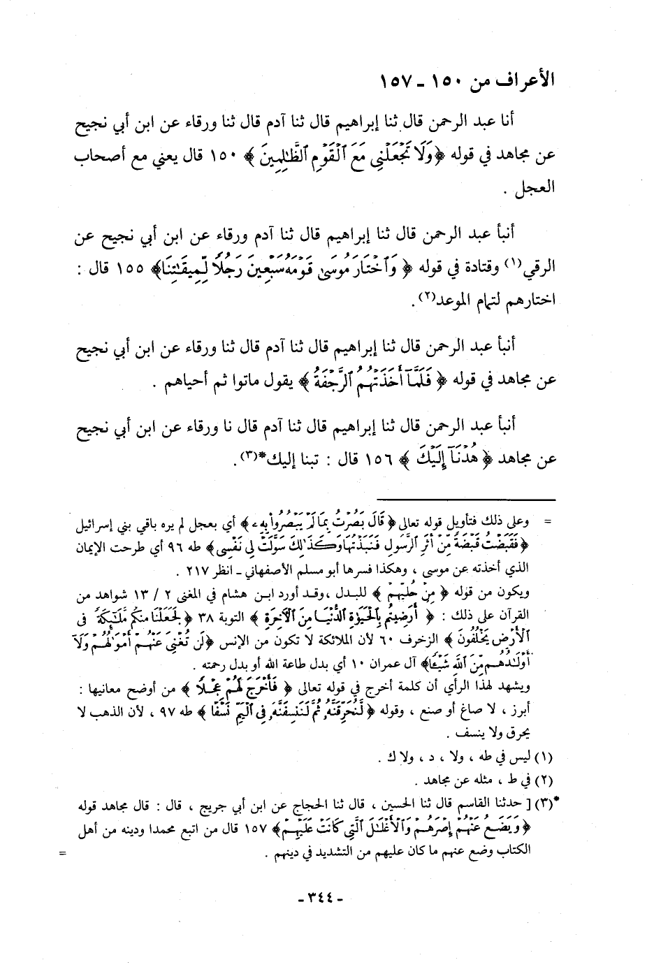 أنا عَبْدُ الرَّحْمَنِ، قَالَ: ثنا إِبْرَاهِيمُ، قَالَ: ثنا آدَمُ، قَالَ: ثنا وَرْقَاءُ، عَنِ ابْنِ أَبِي نَجِيحٍ، عَنْ مُجَاهِدٍ، فِي قَوْلِهِ: {§وَلَا تَجْعَلْنِي مَعَ الْقَوْمِ الظَّالِمِينَ} [الأعراف: 150] ، قَالَ: «يَعْنِي مَعَ أَصْحَابِ الْعِجْلِ»