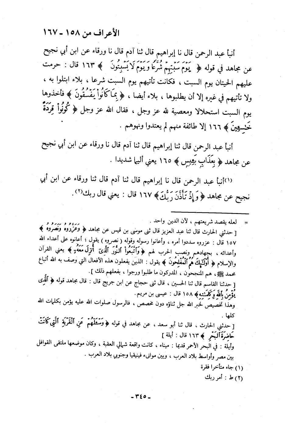 أنبأ عَبْدُ الرَّحْمَنِ، قَالَ: نا إِبْرَاهِيمُ، قَالَ: ثنا آدَمُ، قَالَ: نا وَرْقَاءُ، عَنِ ابْنِ أَبِي نَجِيحٍ، عَنْ مُجَاهِدٍ، فِي قَوْلِهِ: {يَوْمَ سَبْتِهِمْ شُرَّعًا وَيَوْمَ لَا يَسْبِتُونَ} [الأعراف: 163] قَالَ: " §حُرِّمَتْ عَلَيْهِمُ الْحِيتَانُ يَوْمَ السَّبْتِ فَكَانَتْ تَأْتِيهِمْ يَوْمَ السَّبْتِ شُرَّعًا، بَلَاءً ابْتُلُوا بِهِ، وَلَا تَأْتِيهِمْ فِي غَيْرِهِ إِلَّا أَنْ يَطْلُبُوهَا، بَلَاءً أَيْضًا، {بِمَا كَانُوا يَفْسُقُونَ} [الأعراف: 163] فَأَخَذُوهَا يَوْمَ السَّبْتِ اسْتِحْلَالًا وَمَعْصِيَةً لِلَّهِ عَزَّ وَجَلَّ، فَقَالَ اللَّهُ عَزَّ وَجَلَّ: {كُونُوا قِرَدَةً خَاسِئِينَ} [الأعراف: 166] إِلَّا طَائِفَةً مِنْهُمْ لَمْ يَعْتَدُوا وَنَهَوْهُمْ