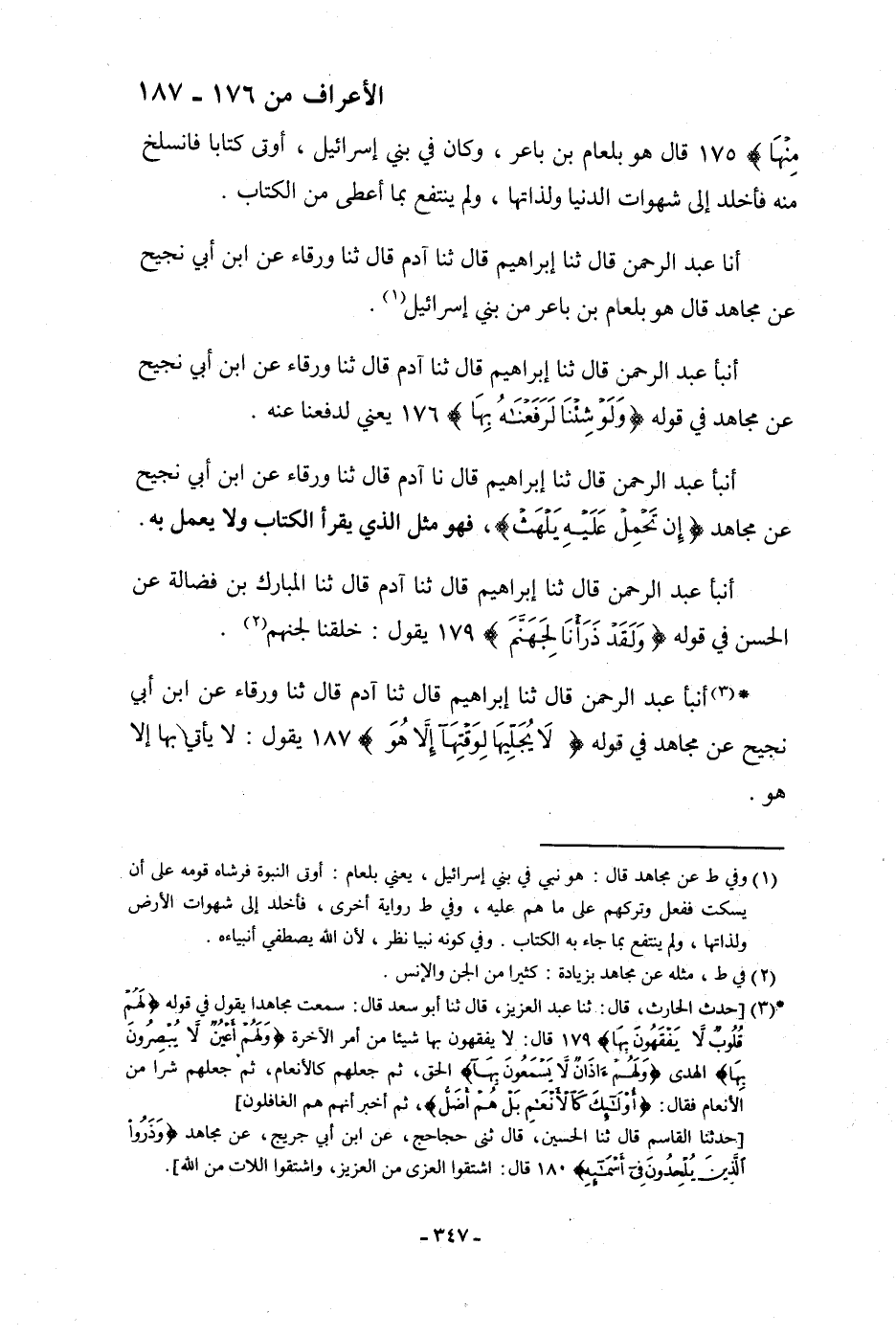 أنبأ عَبْدُ الرَّحْمَنِ، قَالَ: ثنا إِبْرَاهِيمُ، قَالَ: ثنا آدَمُ، قَالَ: ثنا وَرْقَاءُ، عَنِ ابْنِ أَبِي نَجِيحٍ، عَنْ مُجَاهِدٍ، فِي قَوْلِهِ: {§وَلَوْ شِئْنَا لَرَفَعْنَاهُ بِهَا} [الأعراف: 176] يَعْنِي: «لَدَفَعْنَا عَنْهُ»