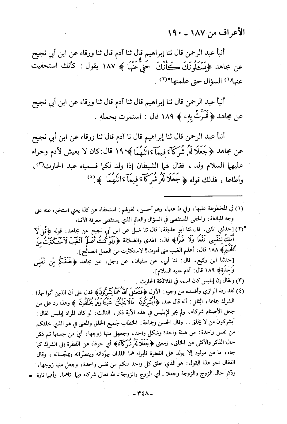 أنبأ عَبْدُ الرَّحْمَنِ، قَالَ: ثنا إِبْرَاهِيمُ، قَالَ: نا آدَمُ، قَالَ: ثنا وَرْقَاءُ، عَنِ ابْنِ أَبِي نَجِيحٍ، عَنْ مُجَاهِدٍ: {جَعَلَا لَهُ شُرَكَاءَ فِيمَا آتَاهُمَا} [الأعراف: 190] قَالَ: " كَانَ §لَا يَعِيشُ لِآدَمَ وَحَوَّاءَ عَلَيْهِمَا السَّلَامُ وَلَدٌ، فَقَالَ لَهُمَا الشَّيْطَانُ: إِذَا وُلِدَ لَكُمَا فَسَمِّيَاهُ عَبْدَ الْحَارِثِ وَأَطَاعَا فَذَلِكَ قَوْلُهُ: {جَعَلَا لَهُ شُرَكَاءَ فِيمَا آتَاهُمَا} [الأعراف: 190] "