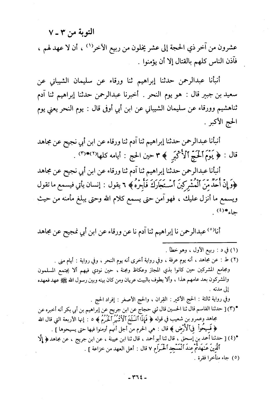 أَنْبَأَنَا عَبْدُ الرَّحْمَنِ، حَدَّثَنَا إِبْرَاهِيمُ، ثنا آدَمُ، ثنا وَرْقَاءُ، عَنِ ابْنِ أَبِي نَجِيحٍ، عَنْ مُجَاهِدٍ، قَالَ: {§يَوْمَ الْحَجِّ الْأَكْبَرِ} [التوبة: 3] حِينَ الْحَجِّ: «أَيَّامَهُ كُلَّهَا»