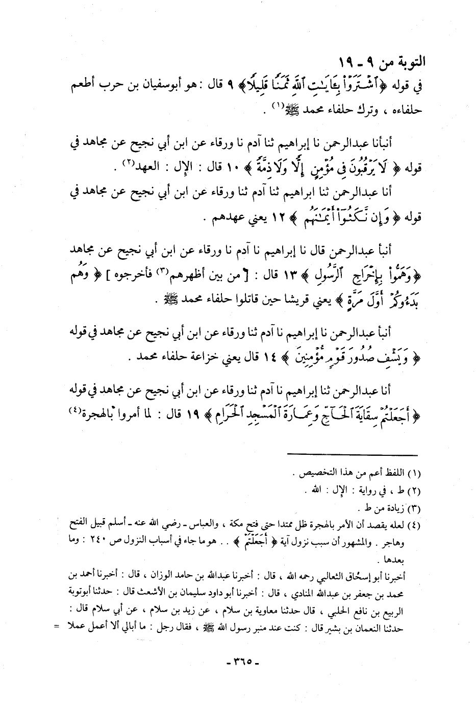 أَنْبَأَنَا عَبْدُ الرَّحْمَنِ، نا إِبْرَاهِيمُ، ثنا آدَمُ، نا وَرْقَاءُ، عَنِ ابْنِ أَبِي نَجِيحٍ، عَنْ مُجَاهِدٍ، فِي قَوْلِهِ: {§لَا يَرْقُبُونَ فِي مُؤْمِنٍ إِلًّا وَلَا ذِمَّةً} [التوبة: 10] قَالَ: " الْإِلُّ: الْعَهْدُ "