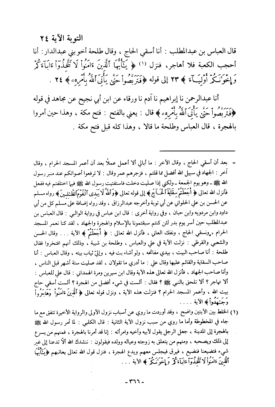 أنا عَبْدُ الرَّحْمَنِ، نا إِبْرَاهِيمُ، نا آدَمُ، نا وَرْقَاءُ، عَنِ ابْنِ أَبِي نَجِيحٍ، عَنْ مُجَاهِدٍ، فِي قَوْلِهِ: {فَتَرَبَّصُوا حَتَّى يَأْتِيَ اللَّهُ بِأَمْرِهِ} [التوبة: 24] قَالَ: " §يَعْنِي بِالْفَتْحِ فَتْحَ مَكَّةَ، وَهَذَا حِينَ أُمِرُوا بِالْهِجْرَةِ، قَالَ الْعَبَّاسُ: وَطَلْحَةُ مَا قَالَا وَهَذَا كُلُّهُ قَبْلَ فَتْحِ مَكَّةَ "