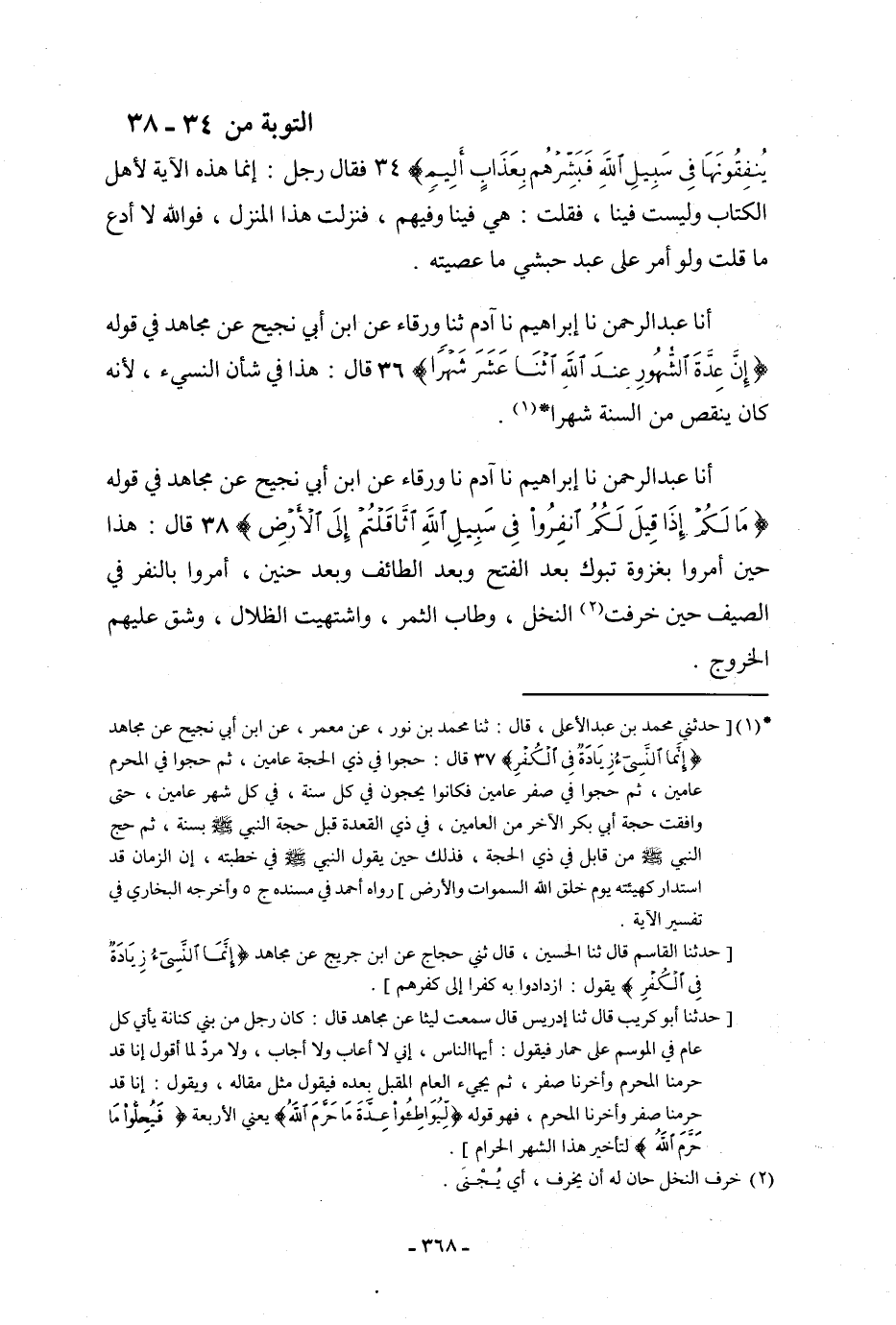أنا عَبْدُ الرَّحْمَنِ، نا إِبْرَاهِيمُ نا آدَمُ، نا وَرْقَاءُ، عَنِ ابْنِ أَبِي نَجِيحٍ، عَنْ مُجَاهِدٍ، فِي قَوْلِهِ: {مَا لَكُمْ إِذَا قِيلَ لَكُمُ انْفِرُوا فِي سَبِيلِ اللَّهِ اثَّاقَلْتُمْ إِلَى الْأَرْضِ} [التوبة: 38] قَالَ: «§هَذَا حِينَ أُمِرُوا بِغَزْوَةِ تَبُوكَ بَعْدَ الْفَتْحِ وَبَعْدَ الطَّائِفِ وَبَعْدَ حُنَيْنٍ، أُمِرُوا بِالنَّفْرِ فِي الصَّيْفِ حِينَ خَرِفْتَ النَّخْلُ، وَطَابَ الثَّمَرُ، وَاشْتُهِيَتِ الظِّلَالُ، وَشَقَّ عَلَيْهِمُ الْخُرُوجُ»