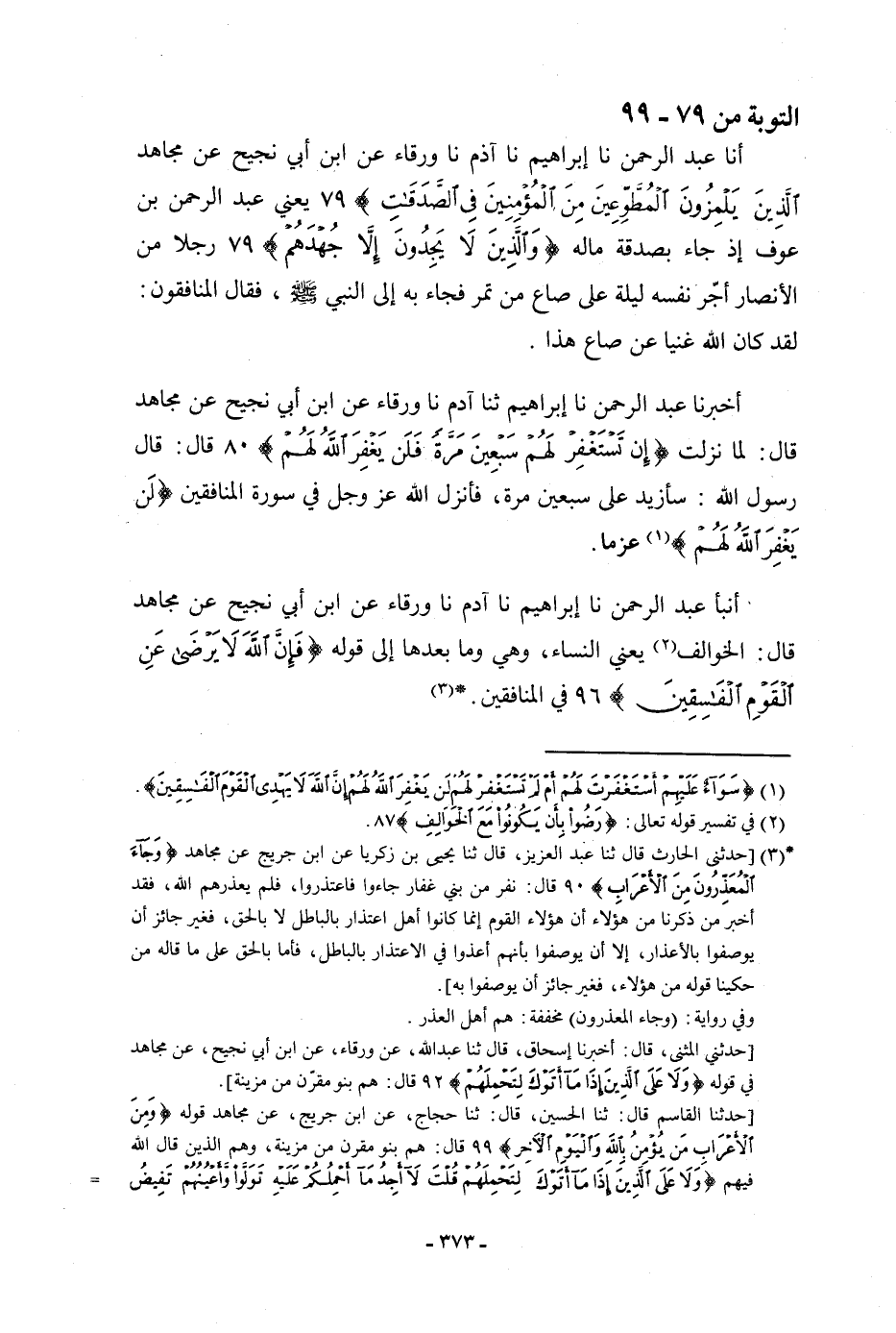 أنا عَبْدُ الرَّحْمَنِ، نا إِبْرَاهِيمُ، نا آدَمُ، نا وَرْقَاءُ، عَنِ ابْنِ أَبِي نَجِيحٍ، عَنْ مُجَاهِدٍ، {الَّذِينَ يَلْمِزُونَ الْمُطَّوِّعِينَ مِنَ الْمُؤْمِنِينَ فِي الصَّدَقَاتِ} [التوبة: 79] يَعْنِي: «§عَبْدَ الرَّحْمَنِ بْنَ عَوْفٍ إِذْ جَاءَ بِصَدَقَةِ مَالِهِ» . {وَالَّذِينَ لَا يَجِدُونَ إِلَّا جُهْدَهُمْ} [التوبة: 79] " رَجُلًا مِنَ الْأَنْصَارِ أَجَّرَ نَفْسَهُ لَيْلَةً عَلَى صَاعٍ مِنْ تَمْرٍ فَجَاءَ بِهِ إِلَى النَّبِيِّ صَلَّى اللَّهُ عَلَيْهِ وَسَلَّمَ، فَقَالَ الْمُنَافِقُونَ: لَقَدْ كَانَ اللَّهُ غَنِيًّا عَنْ صَاعِ هَذَا "