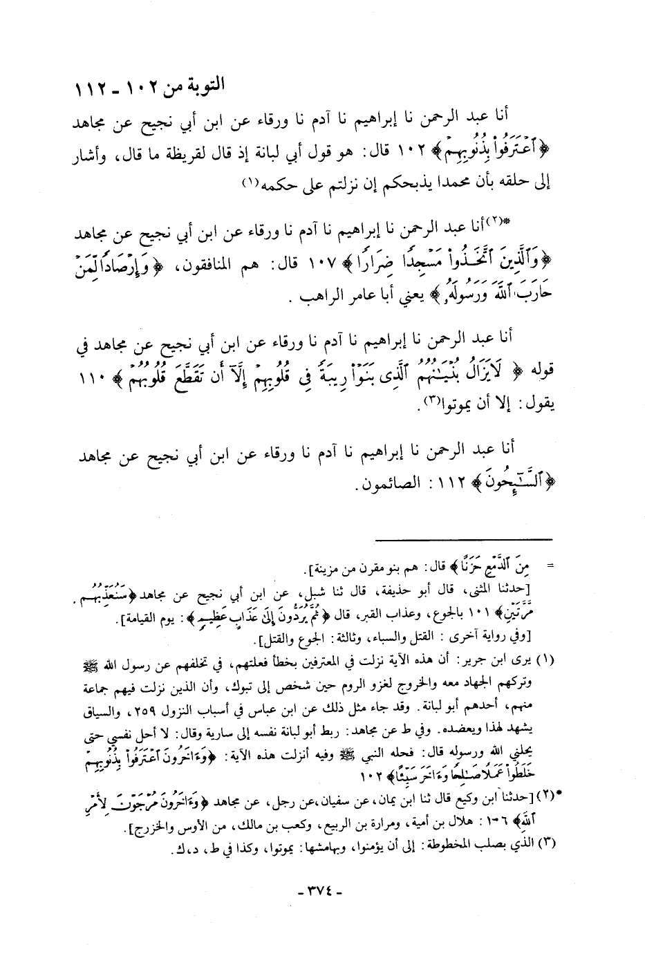 أنا عَبْدُ الرَّحْمَنِ، نا إِبْرَاهِيمُ، نا آدَمُ، نا وَرْقَاءُ، عَنِ ابْنِ أَبِي نَجِيحٍ، عَنْ مُجَاهِدٍ، {§اعْتَرَفُوا بِذُنُوبِهِمْ} [التوبة: 102] قَالَ: «هُوَ قَوْلُ أَبِي لُبَابَةَ، إِذْ قَالَ لِقُرَيْظَةَ مَا قَالَ، وَأَشَارَ إِلَى حَلْقِهِ بِأَنَّ مُحَمَّدًا يَذْبَحُكُمْ إِنْ نَزَلْتُمْ عَلَى حُكْمِهِ»