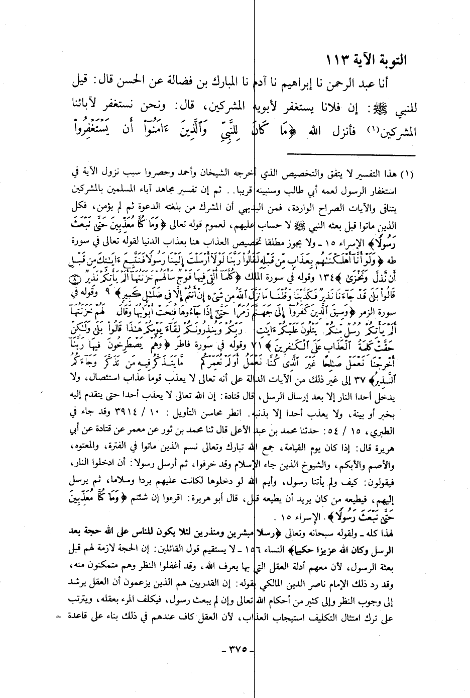 أنا عَبْدُ الرَّحْمَنِ، نا إِبْرَاهِيمُ، نا آدَمُ، نا الْمُبَارَكُ بْنُ فَضَالَةَ، عَنِ الْحَسَنِ، قَالَ: قِيلَ لِلنَّبِيِّ صَلَّى اللَّهُ عَلَيْهِ وَسَلَّمَ: إِنَّ فُلَانًا يَسْتَغْفِرُ لِأَبَوَيْهِ الْمُشْرِكَيْنِ، قَالَ: «§وَنَحْنُ نَسْتَغْفِرُ لِآبَائِنَا الْمُشْرِكِينَ» ، فَأَنْزَلَ اللَّهُ {مَا كَانَ لِلنَّبِيِّ وَالَّذِينَ آمَنُوا أَنْ يَسْتَغْفِرُوا -[376]- لِلْمُشْرِكِينَ} [التوبة: 113] إِلَى قَوْلِهِ {فَلَمَّا تَبَيَّنَ لَهُ أَنَّهُ عَدُوٌّ لِلَّهِ تَبَرَّأَ مِنْهُ} [التوبة: 114] «فَأَمْسَكُوا عَنِ الِاسْتِغْفَارِ لَهُمْ»