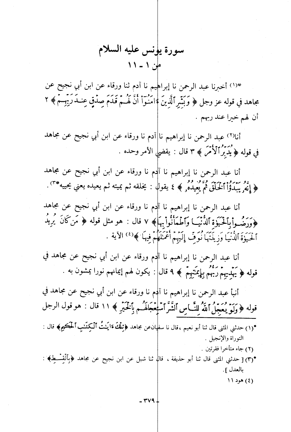 أنا عَبْدُ الرَّحْمَنِ، نا إِبْرَاهِيمُ، نا آدَمُ، نا وَرْقَاءُ، عَنِ ابْنِ أَبِي نَجِيحٍ، عَنْ مُجَاهِدٍ، فِي قَوْلِهِ: {يُدَبِّرُ الْأَمْرَ} [يونس: 3] قَالَ: «§يَقْضِي الْأَمْرَ وَحْدَهُ»