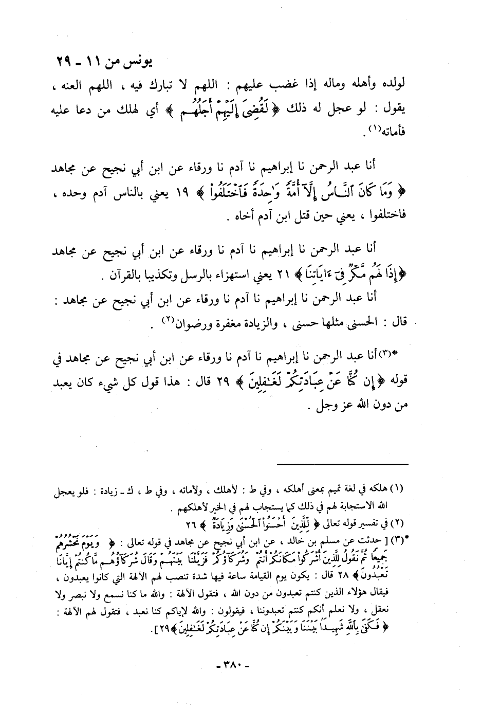 أنا عَبْدُ الرَّحْمَنِ، نا إِبْرَاهِيمُ، نا آدَمُ، نا وَرْقَاءُ، عَنِ ابْنِ أَبِي نَجِيحٍ، عَنْ مُجَاهِدٍ، فِي قَوْلِهِ: {إِنْ كُنَّا عَنْ عِبَادِتِكُمْ لَغَافِلِينَ} [يونس: 29] قَالَ: «§هَذَا قَوْلُ كُلِّ شَيْءٍ كَانَ يُعْبَدُ مِنْ دُونِ اللَّهِ عَزَّ وَجَلَّ»